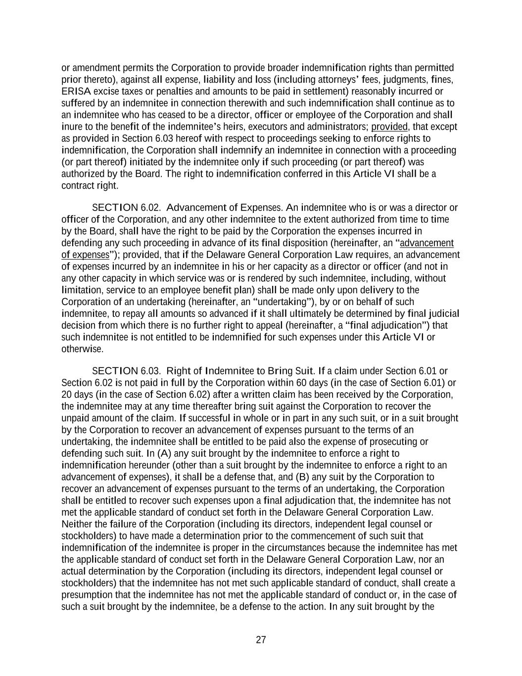 27 or amendment permits the Corporation to provide broader indemnification rights than permitted prior thereto), against all expense, liability and loss (including attorneys’ fees, judgments, fines, ERISA excise taxes or penalties and amounts to be paid in settlement) reasonably incurred or suffered by an indemnitee in connection therewith and such indemnification shall continue as to an indemnitee who has ceased to be a director, officer or employee of the Corporation and shall inure to the benefit of the indemnitee’s heirs, executors and administrators; provided, that except as provided in Section 6.03 hereof with respect to proceedings seeking to enforce rights to indemnification, the Corporation shall indemnify an indemnitee in connection with a proceeding (or part thereof) initiated by the indemnitee only if such proceeding (or part thereof) was authorized by the Board. The right to indemnification conferred in this Article VI shall be a contract right. SECTION 6.02. Advancement of Expenses. An indemnitee who is or was a director or officer of the Corporation, and any other indemnitee to the extent authorized from time to time by the Board, shall have the right to be paid by the Corporation the expenses incurred in defending any such proceeding in advance of its final disposition (hereinafter, an “advancement of expenses”); provided, that if the Delaware General Corporation Law requires, an advancement of expenses incurred by an indemnitee in his or her capacity as a director or officer (and not in any other capacity in which service was or is rendered by such indemnitee, including, without limitation, service to an employee benefit plan) shall be made only upon delivery to the Corporation of an undertaking (hereinafter, an “undertaking”), by or on behalf of such indemnitee, to repay all amounts so advanced if it shall ultimately be determined by final judicial decision from which there is no further right to appeal (hereinafter, a “final adjudication”) that such indemnitee is not entitled to be indemnified for such expenses under this Article VI or otherwise. SECTION 6.03. Right of Indemnitee to Bring Suit. If a claim under Section 6.01 or Section 6.02 is not paid in full by the Corporation within 60 days (in the case of Section 6.01) or 20 days (in the case of Section 6.02) after a written claim has been received by the Corporation, the indemnitee may at any time thereafter bring suit against the Corporation to recover the unpaid amount of the claim. If successful in whole or in part in any such suit, or in a suit brought by the Corporation to recover an advancement of expenses pursuant to the terms of an undertaking, the indemnitee shall be entitled to be paid also the expense of prosecuting or defending such suit. In (A) any suit brought by the indemnitee to enforce a right to indemnification hereunder (other than a suit brought by the indemnitee to enforce a right to an advancement of expenses), it shall be a defense that, and (B) any suit by the Corporation to recover an advancement of expenses pursuant to the terms of an undertaking, the Corporation shall be entitled to recover such expenses upon a final adjudication that, the indemnitee has not met the applicable standard of conduct set forth in the Delaware General Corporation Law. Neither the failure of the Corporation (including its directors, independent legal counsel or stockholders) to have made a determination prior to the commencement of such suit that indemnification of the indemnitee is proper in the circumstances because the indemnitee has met the applicable standard of conduct set forth in the Delaware General Corporation Law, nor an actual determination by the Corporation (including its directors, independent legal counsel or stockholders) that the indemnitee has not met such applicable standard of conduct, shall create a presumption that the indemnitee has not met the applicable standard of conduct or, in the case of such a suit brought by the indemnitee, be a defense to the action. In any suit brought by the