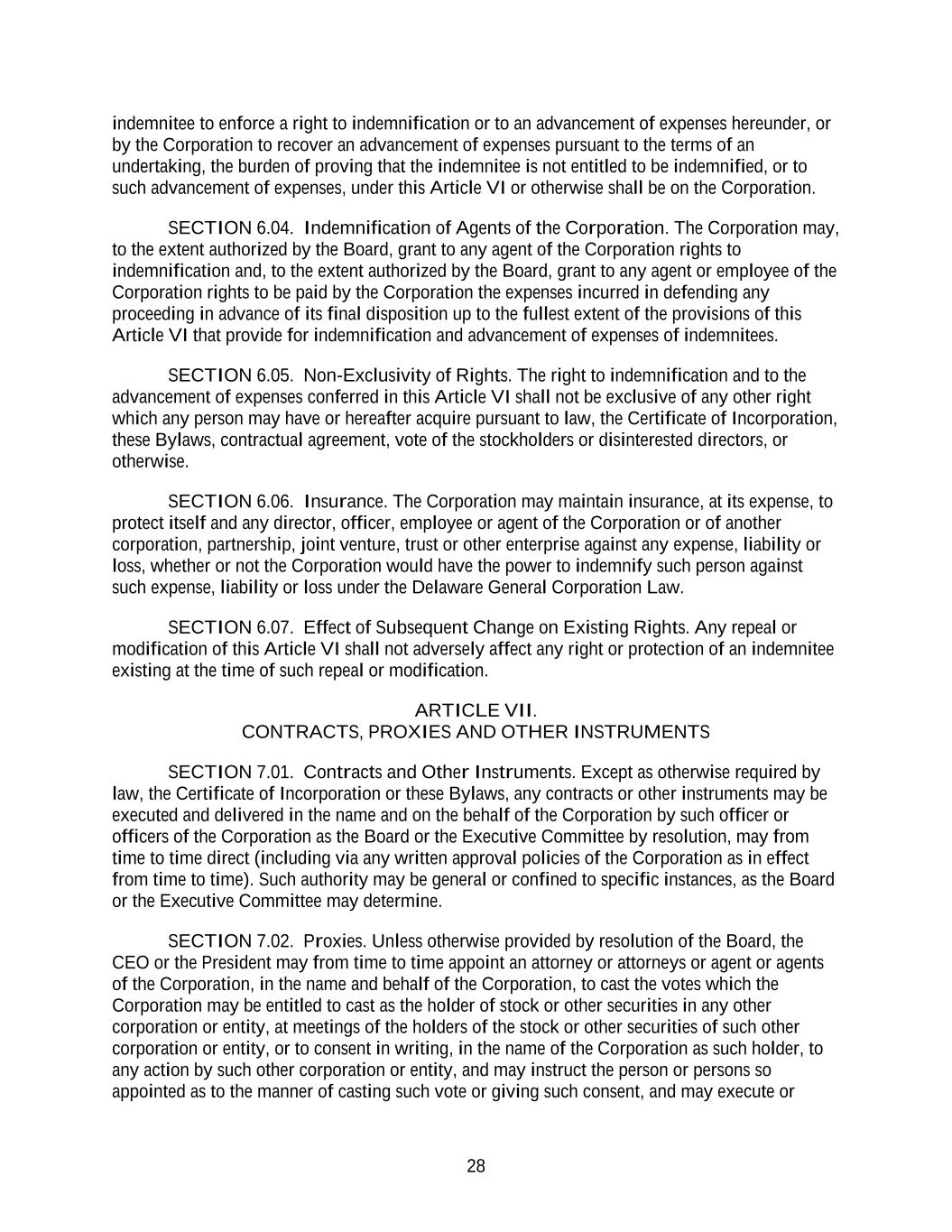 28 indemnitee to enforce a right to indemnification or to an advancement of expenses hereunder, or by the Corporation to recover an advancement of expenses pursuant to the terms of an undertaking, the burden of proving that the indemnitee is not entitled to be indemnified, or to such advancement of expenses, under this Article VI or otherwise shall be on the Corporation. SECTION 6.04. Indemnification of Agents of the Corporation. The Corporation may, to the extent authorized by the Board, grant to any agent of the Corporation rights to indemnification and, to the extent authorized by the Board, grant to any agent or employee of the Corporation rights to be paid by the Corporation the expenses incurred in defending any proceeding in advance of its final disposition up to the fullest extent of the provisions of this Article VI that provide for indemnification and advancement of expenses of indemnitees. SECTION 6.05. Non-Exclusivity of Rights. The right to indemnification and to the advancement of expenses conferred in this Article VI shall not be exclusive of any other right which any person may have or hereafter acquire pursuant to law, the Certificate of Incorporation, these Bylaws, contractual agreement, vote of the stockholders or disinterested directors, or otherwise. SECTION 6.06. Insurance. The Corporation may maintain insurance, at its expense, to protect itself and any director, officer, employee or agent of the Corporation or of another corporation, partnership, joint venture, trust or other enterprise against any expense, liability or loss, whether or not the Corporation would have the power to indemnify such person against such expense, liability or loss under the Delaware General Corporation Law. SECTION 6.07. Effect of Subsequent Change on Existing Rights. Any repeal or modification of this Article VI shall not adversely affect any right or protection of an indemnitee existing at the time of such repeal or modification. ARTICLE VII. CONTRACTS, PROXIES AND OTHER INSTRUMENTS SECTION 7.01. Contracts and Other Instruments. Except as otherwise required by law, the Certificate of Incorporation or these Bylaws, any contracts or other instruments may be executed and delivered in the name and on the behalf of the Corporation by such officer or officers of the Corporation as the Board or the Executive Committee by resolution, may from time to time direct (including via any written approval policies of the Corporation as in effect from time to time). Such authority may be general or confined to specific instances, as the Board or the Executive Committee may determine. SECTION 7.02. Proxies. Unless otherwise provided by resolution of the Board, the CEO or the President may from time to time appoint an attorney or attorneys or agent or agents of the Corporation, in the name and behalf of the Corporation, to cast the votes which the Corporation may be entitled to cast as the holder of stock or other securities in any other corporation or entity, at meetings of the holders of the stock or other securities of such other corporation or entity, or to consent in writing, in the name of the Corporation as such holder, to any action by such other corporation or entity, and may instruct the person or persons so appointed as to the manner of casting such vote or giving such consent, and may execute or