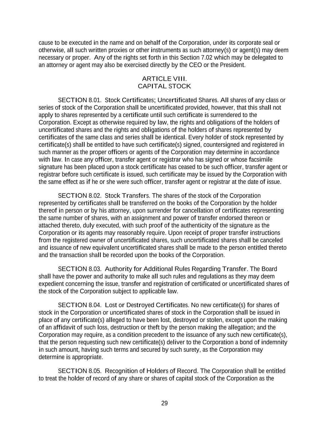 29 cause to be executed in the name and on behalf of the Corporation, under its corporate seal or otherwise, all such written proxies or other instruments as such attorney(s) or agent(s) may deem necessary or proper. Any of the rights set forth in this Section 7.02 which may be delegated to an attorney or agent may also be exercised directly by the CEO or the President. ARTICLE VIII. CAPITAL STOCK SECTION 8.01. Stock Certificates; Uncertificated Shares. All shares of any class or series of stock of the Corporation shall be uncertificated provided, however, that this shall not apply to shares represented by a certificate until such certificate is surrendered to the Corporation. Except as otherwise required by law, the rights and obligations of the holders of uncertificated shares and the rights and obligations of the holders of shares represented by certificates of the same class and series shall be identical. Every holder of stock represented by certificate(s) shall be entitled to have such certificate(s) signed, countersigned and registered in such manner as the proper officers or agents of the Corporation may determine in accordance with law. In case any officer, transfer agent or registrar who has signed or whose facsimile signature has been placed upon a stock certificate has ceased to be such officer, transfer agent or registrar before such certificate is issued, such certificate may be issued by the Corporation with the same effect as if he or she were such officer, transfer agent or registrar at the date of issue. SECTION 8.02. Stock Transfers. The shares of the stock of the Corporation represented by certificates shall be transferred on the books of the Corporation by the holder thereof in person or by his attorney, upon surrender for cancellation of certificates representing the same number of shares, with an assignment and power of transfer endorsed thereon or attached thereto, duly executed, with such proof of the authenticity of the signature as the Corporation or its agents may reasonably require. Upon receipt of proper transfer instructions from the registered owner of uncertificated shares, such uncertificated shares shall be canceled and issuance of new equivalent uncertificated shares shall be made to the person entitled thereto and the transaction shall be recorded upon the books of the Corporation. SECTION 8.03. Authority for Additional Rules Regarding Transfer. The Board shall have the power and authority to make all such rules and regulations as they may deem expedient concerning the issue, transfer and registration of certificated or uncertificated shares of the stock of the Corporation subject to applicable law. SECTION 8.04. Lost or Destroyed Certificates. No new certificate(s) for shares of stock in the Corporation or uncertificated shares of stock in the Corporation shall be issued in place of any certificate(s) alleged to have been lost, destroyed or stolen, except upon the making of an affidavit of such loss, destruction or theft by the person making the allegation; and the Corporation may require, as a condition precedent to the issuance of any such new certificate(s), that the person requesting such new certificate(s) deliver to the Corporation a bond of indemnity in such amount, having such terms and secured by such surety, as the Corporation may determine is appropriate. SECTION 8.05. Recognition of Holders of Record. The Corporation shall be entitled to treat the holder of record of any share or shares of capital stock of the Corporation as the