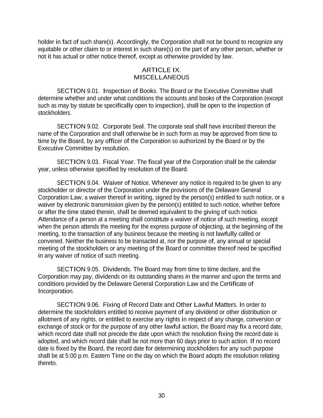 30 holder in fact of such share(s). Accordingly, the Corporation shall not be bound to recognize any equitable or other claim to or interest in such share(s) on the part of any other person, whether or not it has actual or other notice thereof, except as otherwise provided by law. ARTICLE IX. MISCELLANEOUS SECTION 9.01. Inspection of Books. The Board or the Executive Committee shall determine whether and under what conditions the accounts and books of the Corporation (except such as may by statute be specifically open to inspection), shall be open to the inspection of stockholders. SECTION 9.02. Corporate Seal. The corporate seal shall have inscribed thereon the name of the Corporation and shall otherwise be in such form as may be approved from time to time by the Board, by any officer of the Corporation so authorized by the Board or by the Executive Committee by resolution. SECTION 9.03. Fiscal Year. The fiscal year of the Corporation shall be the calendar year, unless otherwise specified by resolution of the Board. SECTION 9.04. Waiver of Notice. Whenever any notice is required to be given to any stockholder or director of the Corporation under the provisions of the Delaware General Corporation Law, a waiver thereof in writing, signed by the person(s) entitled to such notice, or a waiver by electronic transmission given by the person(s) entitled to such notice, whether before or after the time stated therein, shall be deemed equivalent to the giving of such notice. Attendance of a person at a meeting shall constitute a waiver of notice of such meeting, except when the person attends the meeting for the express purpose of objecting, at the beginning of the meeting, to the transaction of any business because the meeting is not lawfully called or convened. Neither the business to be transacted at, nor the purpose of, any annual or special meeting of the stockholders or any meeting of the Board or committee thereof need be specified in any waiver of notice of such meeting. SECTION 9.05. Dividends. The Board may from time to time declare, and the Corporation may pay, dividends on its outstanding shares in the manner and upon the terms and conditions provided by the Delaware General Corporation Law and the Certificate of Incorporation. SECTION 9.06. Fixing of Record Date and Other Lawful Matters. In order to determine the stockholders entitled to receive payment of any dividend or other distribution or allotment of any rights, or entitled to exercise any rights in respect of any change, conversion or exchange of stock or for the purpose of any other lawful action, the Board may fix a record date, which record date shall not precede the date upon which the resolution fixing the record date is adopted, and which record date shall be not more than 60 days prior to such action. If no record date is fixed by the Board, the record date for determining stockholders for any such purpose shall be at 5:00 p.m. Eastern Time on the day on which the Board adopts the resolution relating thereto.