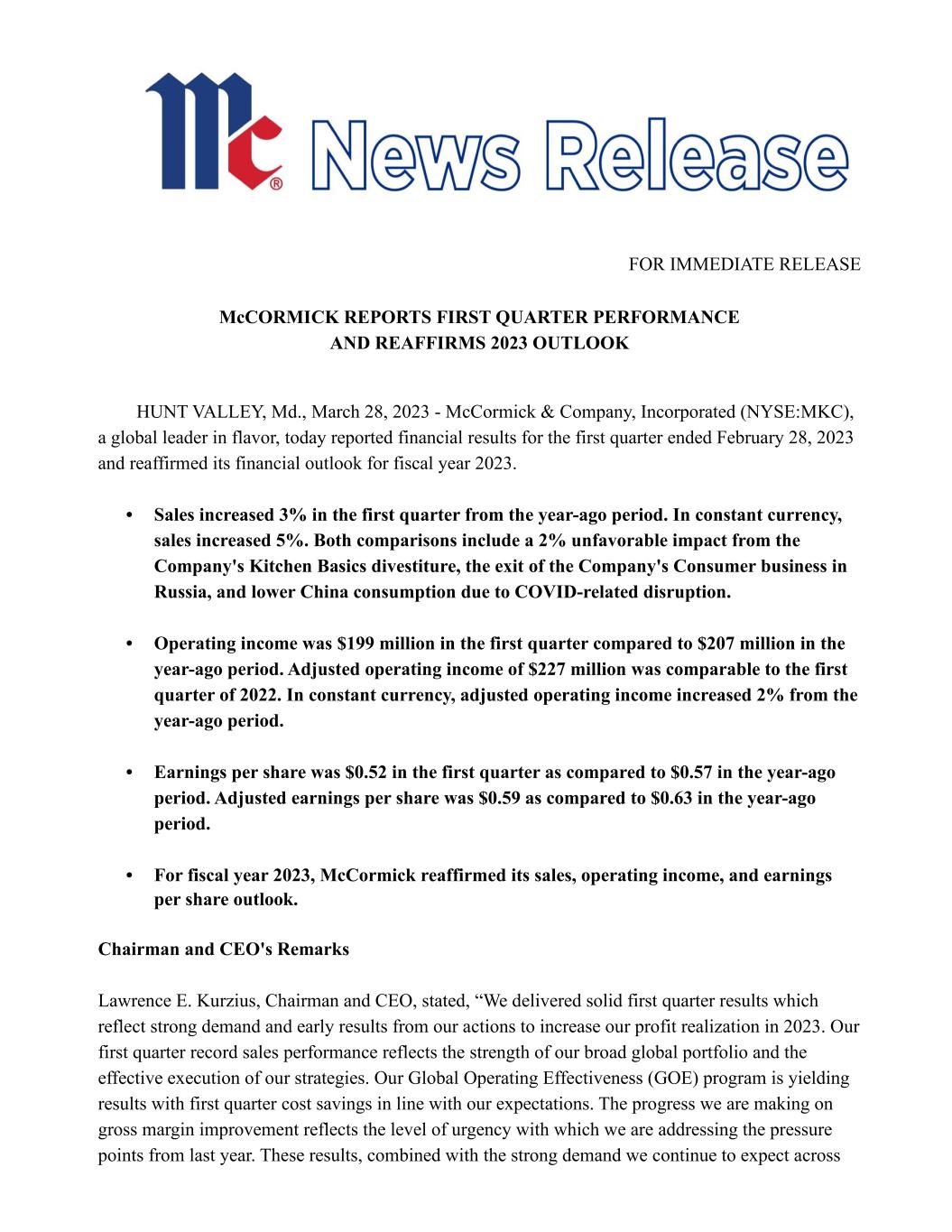FOR IMMEDIATE RELEASE McCORMICK REPORTS FIRST QUARTER PERFORMANCE AND REAFFIRMS 2023 OUTLOOK HUNT VALLEY, Md., March 28, 2023 - McCormick & Company, Incorporated (NYSE:MKC), a global leader in flavor, today reported financial results for the first quarter ended February 28, 2023 and reaffirmed its financial outlook for fiscal year 2023. • Sales increased 3% in the first quarter from the year-ago period. In constant currency, sales increased 5%. Both comparisons include a 2% unfavorable impact from the Company's Kitchen Basics divestiture, the exit of the Company's Consumer business in Russia, and lower China consumption due to COVID-related disruption. • Operating income was $199 million in the first quarter compared to $207 million in the year-ago period. Adjusted operating income of $227 million was comparable to the first quarter of 2022. In constant currency, adjusted operating income increased 2% from the year-ago period. • Earnings per share was $0.52 in the first quarter as compared to $0.57 in the year-ago period. Adjusted earnings per share was $0.59 as compared to $0.63 in the year-ago period. • For fiscal year 2023, McCormick reaffirmed its sales, operating income, and earnings per share outlook. Chairman and CEO's Remarks Lawrence E. Kurzius, Chairman and CEO, stated, “We delivered solid first quarter results which reflect strong demand and early results from our actions to increase our profit realization in 2023. Our first quarter record sales performance reflects the strength of our broad global portfolio and the effective execution of our strategies. Our Global Operating Effectiveness (GOE) program is yielding results with first quarter cost savings in line with our expectations. The progress we are making on gross margin improvement reflects the level of urgency with which we are addressing the pressure points from last year. These results, combined with the strong demand we continue to expect across