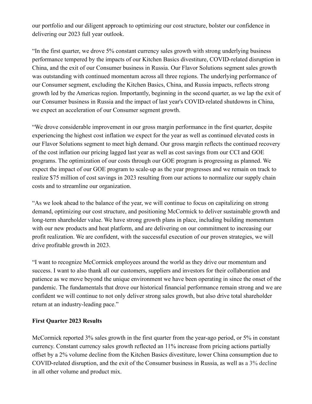 our portfolio and our diligent approach to optimizing our cost structure, bolster our confidence in delivering our 2023 full year outlook. “In the first quarter, we drove 5% constant currency sales growth with strong underlying business performance tempered by the impacts of our Kitchen Basics divestiture, COVID-related disruption in China, and the exit of our Consumer business in Russia. Our Flavor Solutions segment sales growth was outstanding with continued momentum across all three regions. The underlying performance of our Consumer segment, excluding the Kitchen Basics, China, and Russia impacts, reflects strong growth led by the Americas region. Importantly, beginning in the second quarter, as we lap the exit of our Consumer business in Russia and the impact of last year's COVID-related shutdowns in China, we expect an acceleration of our Consumer segment growth. “We drove considerable improvement in our gross margin performance in the first quarter, despite experiencing the highest cost inflation we expect for the year as well as continued elevated costs in our Flavor Solutions segment to meet high demand. Our gross margin reflects the continued recovery of the cost inflation our pricing lagged last year as well as cost savings from our CCI and GOE programs. The optimization of our costs through our GOE program is progressing as planned. We expect the impact of our GOE program to scale-up as the year progresses and we remain on track to realize $75 million of cost savings in 2023 resulting from our actions to normalize our supply chain costs and to streamline our organization. “As we look ahead to the balance of the year, we will continue to focus on capitalizing on strong demand, optimizing our cost structure, and positioning McCormick to deliver sustainable growth and long-term shareholder value. We have strong growth plans in place, including building momentum with our new products and heat platform, and are delivering on our commitment to increasing our profit realization. We are confident, with the successful execution of our proven strategies, we will drive profitable growth in 2023. “I want to recognize McCormick employees around the world as they drive our momentum and success. I want to also thank all our customers, suppliers and investors for their collaboration and patience as we move beyond the unique environment we have been operating in since the onset of the pandemic. The fundamentals that drove our historical financial performance remain strong and we are confident we will continue to not only deliver strong sales growth, but also drive total shareholder return at an industry-leading pace.” First Quarter 2023 Results McCormick reported 3% sales growth in the first quarter from the year-ago period, or 5% in constant currency. Constant currency sales growth reflected an 11% increase from pricing actions partially offset by a 2% volume decline from the Kitchen Basics divestiture, lower China consumption due to COVID-related disruption, and the exit of the Consumer business in Russia, as well as a 3% decline in all other volume and product mix.