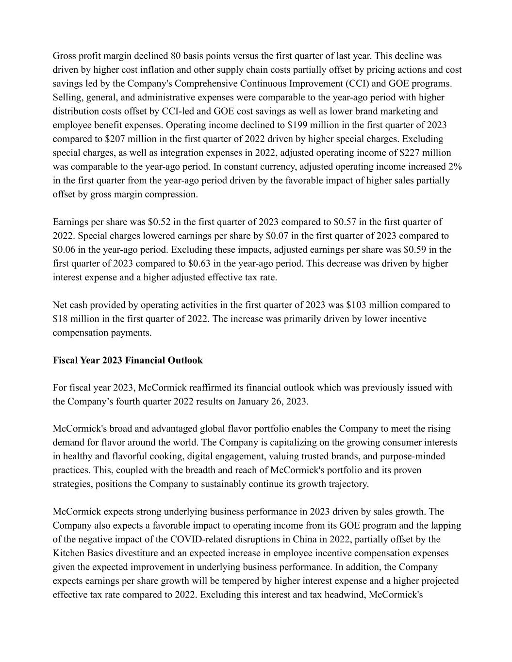 Gross profit margin declined 80 basis points versus the first quarter of last year. This decline was driven by higher cost inflation and other supply chain costs partially offset by pricing actions and cost savings led by the Company's Comprehensive Continuous Improvement (CCI) and GOE programs. Selling, general, and administrative expenses were comparable to the year-ago period with higher distribution costs offset by CCI-led and GOE cost savings as well as lower brand marketing and employee benefit expenses. Operating income declined to $199 million in the first quarter of 2023 compared to $207 million in the first quarter of 2022 driven by higher special charges. Excluding special charges, as well as integration expenses in 2022, adjusted operating income of $227 million was comparable to the year-ago period. In constant currency, adjusted operating income increased 2% in the first quarter from the year-ago period driven by the favorable impact of higher sales partially offset by gross margin compression. Earnings per share was $0.52 in the first quarter of 2023 compared to $0.57 in the first quarter of 2022. Special charges lowered earnings per share by $0.07 in the first quarter of 2023 compared to $0.06 in the year-ago period. Excluding these impacts, adjusted earnings per share was $0.59 in the first quarter of 2023 compared to $0.63 in the year-ago period. This decrease was driven by higher interest expense and a higher adjusted effective tax rate. Net cash provided by operating activities in the first quarter of 2023 was $103 million compared to $18 million in the first quarter of 2022. The increase was primarily driven by lower incentive compensation payments. Fiscal Year 2023 Financial Outlook For fiscal year 2023, McCormick reaffirmed its financial outlook which was previously issued with the Company’s fourth quarter 2022 results on January 26, 2023. McCormick's broad and advantaged global flavor portfolio enables the Company to meet the rising demand for flavor around the world. The Company is capitalizing on the growing consumer interests in healthy and flavorful cooking, digital engagement, valuing trusted brands, and purpose-minded practices. This, coupled with the breadth and reach of McCormick's portfolio and its proven strategies, positions the Company to sustainably continue its growth trajectory. McCormick expects strong underlying business performance in 2023 driven by sales growth. The Company also expects a favorable impact to operating income from its GOE program and the lapping of the negative impact of the COVID-related disruptions in China in 2022, partially offset by the Kitchen Basics divestiture and an expected increase in employee incentive compensation expenses given the expected improvement in underlying business performance. In addition, the Company expects earnings per share growth will be tempered by higher interest expense and a higher projected effective tax rate compared to 2022. Excluding this interest and tax headwind, McCormick's