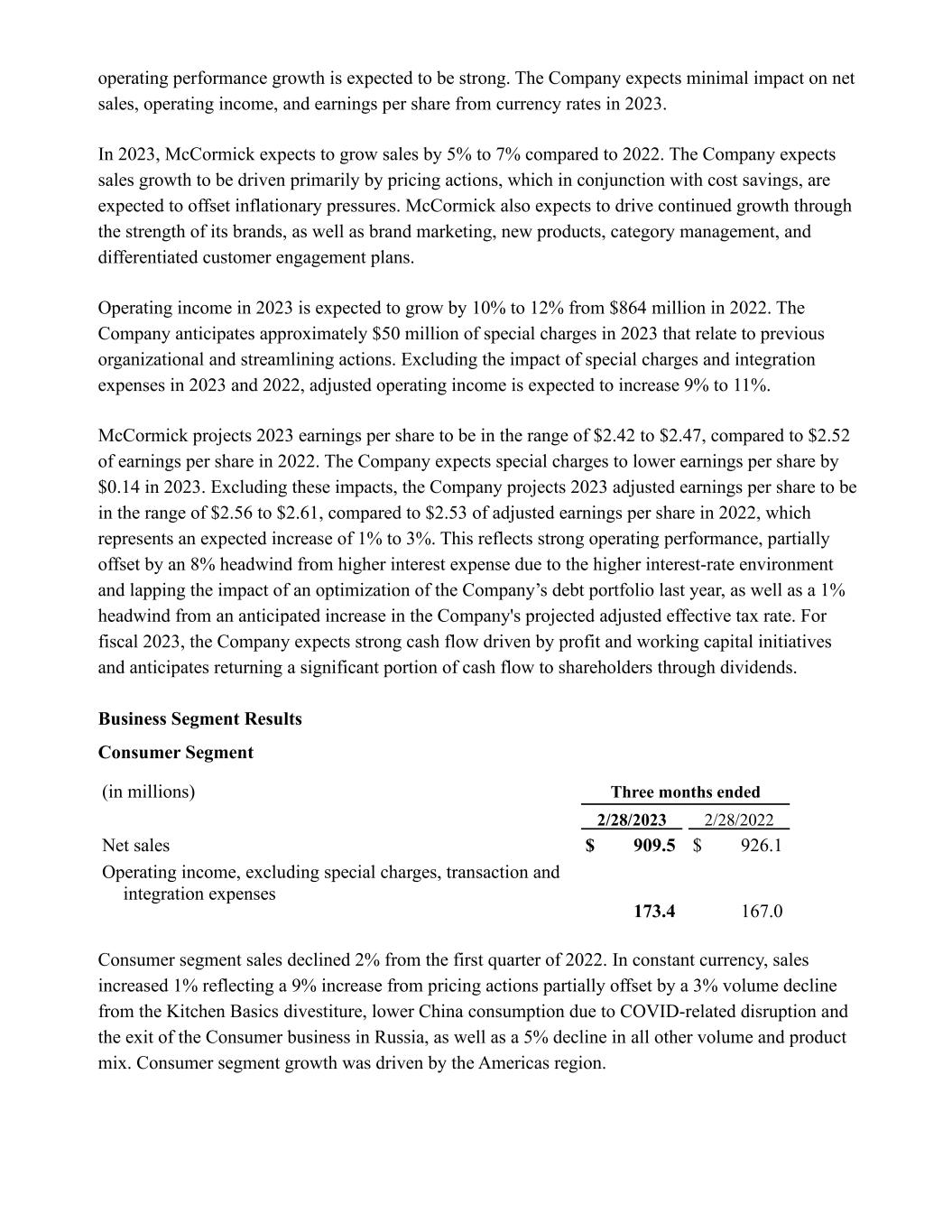 operating performance growth is expected to be strong. The Company expects minimal impact on net sales, operating income, and earnings per share from currency rates in 2023. In 2023, McCormick expects to grow sales by 5% to 7% compared to 2022. The Company expects sales growth to be driven primarily by pricing actions, which in conjunction with cost savings, are expected to offset inflationary pressures. McCormick also expects to drive continued growth through the strength of its brands, as well as brand marketing, new products, category management, and differentiated customer engagement plans. Operating income in 2023 is expected to grow by 10% to 12% from $864 million in 2022. The Company anticipates approximately $50 million of special charges in 2023 that relate to previous organizational and streamlining actions. Excluding the impact of special charges and integration expenses in 2023 and 2022, adjusted operating income is expected to increase 9% to 11%. McCormick projects 2023 earnings per share to be in the range of $2.42 to $2.47, compared to $2.52 of earnings per share in 2022. The Company expects special charges to lower earnings per share by $0.14 in 2023. Excluding these impacts, the Company projects 2023 adjusted earnings per share to be in the range of $2.56 to $2.61, compared to $2.53 of adjusted earnings per share in 2022, which represents an expected increase of 1% to 3%. This reflects strong operating performance, partially offset by an 8% headwind from higher interest expense due to the higher interest-rate environment and lapping the impact of an optimization of the Company’s debt portfolio last year, as well as a 1% headwind from an anticipated increase in the Company's projected adjusted effective tax rate. For fiscal 2023, the Company expects strong cash flow driven by profit and working capital initiatives and anticipates returning a significant portion of cash flow to shareholders through dividends. Business Segment Results Consumer Segment (in millions) Three months ended 2/28/2023 2/28/2022 Net sales $ 909.5 $ 926.1 Operating income, excluding special charges, transaction and integration expenses 173.4 167.0 Consumer segment sales declined 2% from the first quarter of 2022. In constant currency, sales increased 1% reflecting a 9% increase from pricing actions partially offset by a 3% volume decline from the Kitchen Basics divestiture, lower China consumption due to COVID-related disruption and the exit of the Consumer business in Russia, as well as a 5% decline in all other volume and product mix. Consumer segment growth was driven by the Americas region.