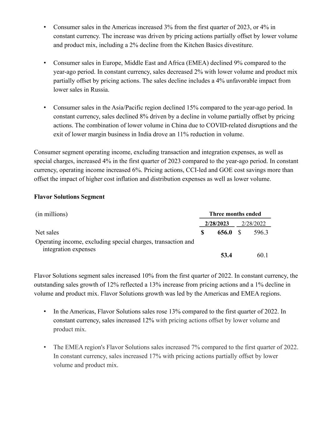• Consumer sales in the Americas increased 3% from the first quarter of 2023, or 4% in constant currency. The increase was driven by pricing actions partially offset by lower volume and product mix, including a 2% decline from the Kitchen Basics divestiture. • Consumer sales in Europe, Middle East and Africa (EMEA) declined 9% compared to the year-ago period. In constant currency, sales decreased 2% with lower volume and product mix partially offset by pricing actions. The sales decline includes a 4% unfavorable impact from lower sales in Russia. • Consumer sales in the Asia/Pacific region declined 15% compared to the year-ago period. In constant currency, sales declined 8% driven by a decline in volume partially offset by pricing actions. The combination of lower volume in China due to COVID-related disruptions and the exit of lower margin business in India drove an 11% reduction in volume. Consumer segment operating income, excluding transaction and integration expenses, as well as special charges, increased 4% in the first quarter of 2023 compared to the year-ago period. In constant currency, operating income increased 6%. Pricing actions, CCI-led and GOE cost savings more than offset the impact of higher cost inflation and distribution expenses as well as lower volume. Flavor Solutions Segment (in millions) Three months ended 2/28/2023 2/28/2022 Net sales $ 656.0 $ 596.3 Operating income, excluding special charges, transaction and integration expenses 53.4 60.1 Flavor Solutions segment sales increased 10% from the first quarter of 2022. In constant currency, the outstanding sales growth of 12% reflected a 13% increase from pricing actions and a 1% decline in volume and product mix. Flavor Solutions growth was led by the Americas and EMEA regions. • In the Americas, Flavor Solutions sales rose 13% compared to the first quarter of 2022. In constant currency, sales increased 12% with pricing actions offset by lower volume and product mix. • The EMEA region's Flavor Solutions sales increased 7% compared to the first quarter of 2022. In constant currency, sales increased 17% with pricing actions partially offset by lower volume and product mix.