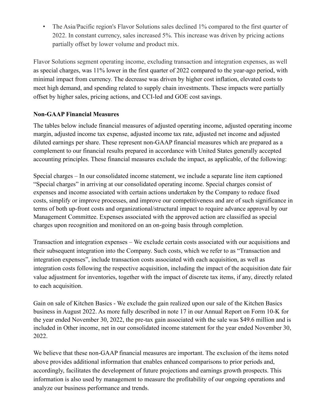 • The Asia/Pacific region's Flavor Solutions sales declined 1% compared to the first quarter of 2022. In constant currency, sales increased 5%. This increase was driven by pricing actions partially offset by lower volume and product mix. Flavor Solutions segment operating income, excluding transaction and integration expenses, as well as special charges, was 11% lower in the first quarter of 2022 compared to the year-ago period, with minimal impact from currency. The decrease was driven by higher cost inflation, elevated costs to meet high demand, and spending related to supply chain investments. These impacts were partially offset by higher sales, pricing actions, and CCI-led and GOE cost savings. Non-GAAP Financial Measures The tables below include financial measures of adjusted operating income, adjusted operating income margin, adjusted income tax expense, adjusted income tax rate, adjusted net income and adjusted diluted earnings per share. These represent non-GAAP financial measures which are prepared as a complement to our financial results prepared in accordance with United States generally accepted accounting principles. These financial measures exclude the impact, as applicable, of the following: Special charges – In our consolidated income statement, we include a separate line item captioned “Special charges” in arriving at our consolidated operating income. Special charges consist of expenses and income associated with certain actions undertaken by the Company to reduce fixed costs, simplify or improve processes, and improve our competitiveness and are of such significance in terms of both up-front costs and organizational/structural impact to require advance approval by our Management Committee. Expenses associated with the approved action are classified as special charges upon recognition and monitored on an on-going basis through completion. Transaction and integration expenses – We exclude certain costs associated with our acquisitions and their subsequent integration into the Company. Such costs, which we refer to as “Transaction and integration expenses”, include transaction costs associated with each acquisition, as well as integration costs following the respective acquisition, including the impact of the acquisition date fair value adjustment for inventories, together with the impact of discrete tax items, if any, directly related to each acquisition. Gain on sale of Kitchen Basics - We exclude the gain realized upon our sale of the Kitchen Basics business in August 2022. As more fully described in note 17 in our Annual Report on Form 10-K for the year ended November 30, 2022, the pre-tax gain associated with the sale was $49.6 million and is included in Other income, net in our consolidated income statement for the year ended November 30, 2022. We believe that these non-GAAP financial measures are important. The exclusion of the items noted above provides additional information that enables enhanced comparisons to prior periods and, accordingly, facilitates the development of future projections and earnings growth prospects. This information is also used by management to measure the profitability of our ongoing operations and analyze our business performance and trends.