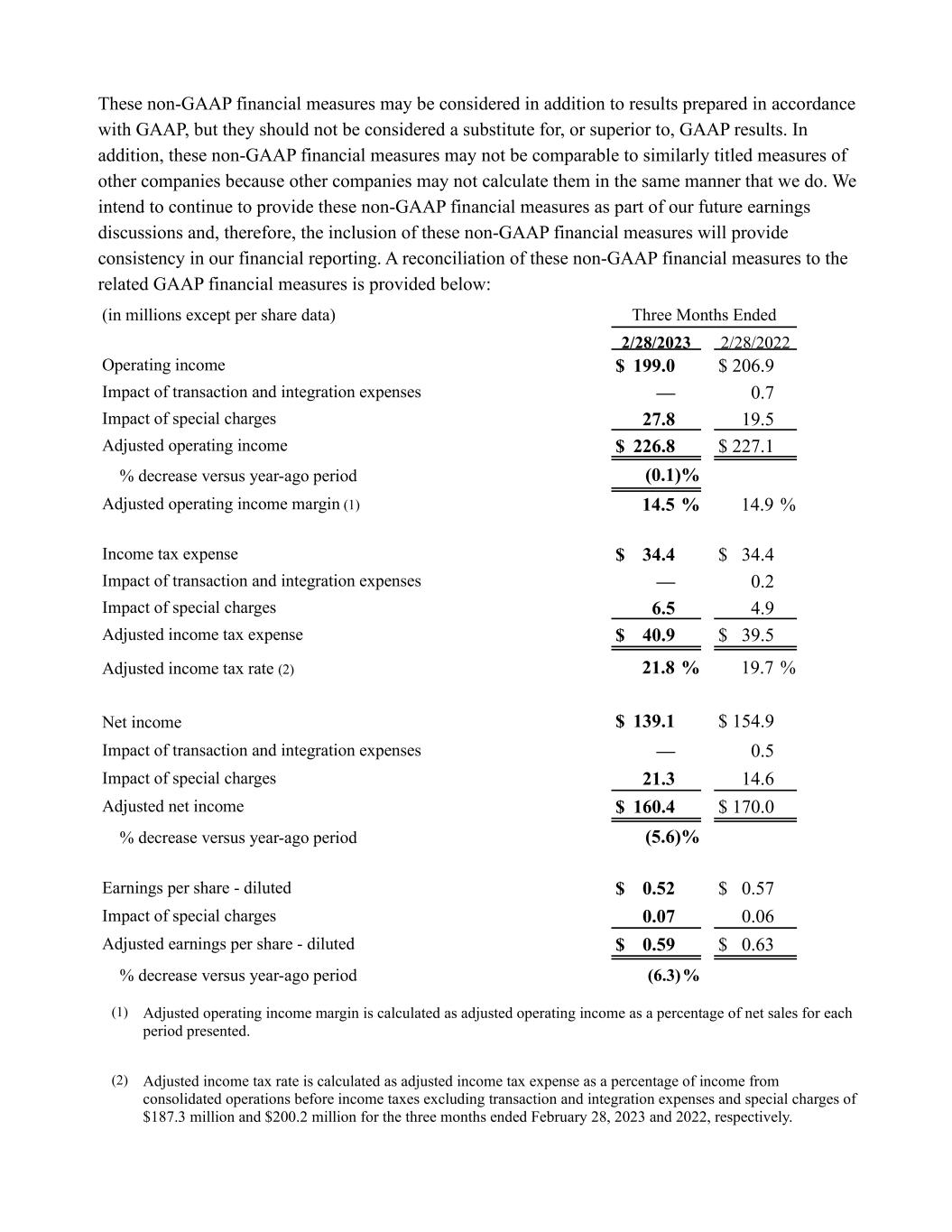 These non-GAAP financial measures may be considered in addition to results prepared in accordance with GAAP, but they should not be considered a substitute for, or superior to, GAAP results. In addition, these non-GAAP financial measures may not be comparable to similarly titled measures of other companies because other companies may not calculate them in the same manner that we do. We intend to continue to provide these non-GAAP financial measures as part of our future earnings discussions and, therefore, the inclusion of these non-GAAP financial measures will provide consistency in our financial reporting. A reconciliation of these non-GAAP financial measures to the related GAAP financial measures is provided below: (in millions except per share data) Three Months Ended 2/28/2023 2/28/2022 Operating income $ 199.0 $ 206.9 Impact of transaction and integration expenses — 0.7 Impact of special charges 27.8 19.5 Adjusted operating income $ 226.8 $ 227.1 % decrease versus year-ago period (0.1) % Adjusted operating income margin (1) 14.5 % 14.9 % Income tax expense $ 34.4 $ 34.4 Impact of transaction and integration expenses — 0.2 Impact of special charges 6.5 4.9 Adjusted income tax expense $ 40.9 $ 39.5 Adjusted income tax rate (2) 21.8 % 19.7 % Net income $ 139.1 $ 154.9 Impact of transaction and integration expenses — 0.5 Impact of special charges 21.3 14.6 Adjusted net income $ 160.4 $ 170.0 % decrease versus year-ago period (5.6) % Earnings per share - diluted $ 0.52 $ 0.57 Impact of special charges 0.07 0.06 Adjusted earnings per share - diluted $ 0.59 $ 0.63 % decrease versus year-ago period (6.3) % (1) Adjusted operating income margin is calculated as adjusted operating income as a percentage of net sales for each period presented. (2) Adjusted income tax rate is calculated as adjusted income tax expense as a percentage of income from consolidated operations before income taxes excluding transaction and integration expenses and special charges of $187.3 million and $200.2 million for the three months ended February 28, 2023 and 2022, respectively.
