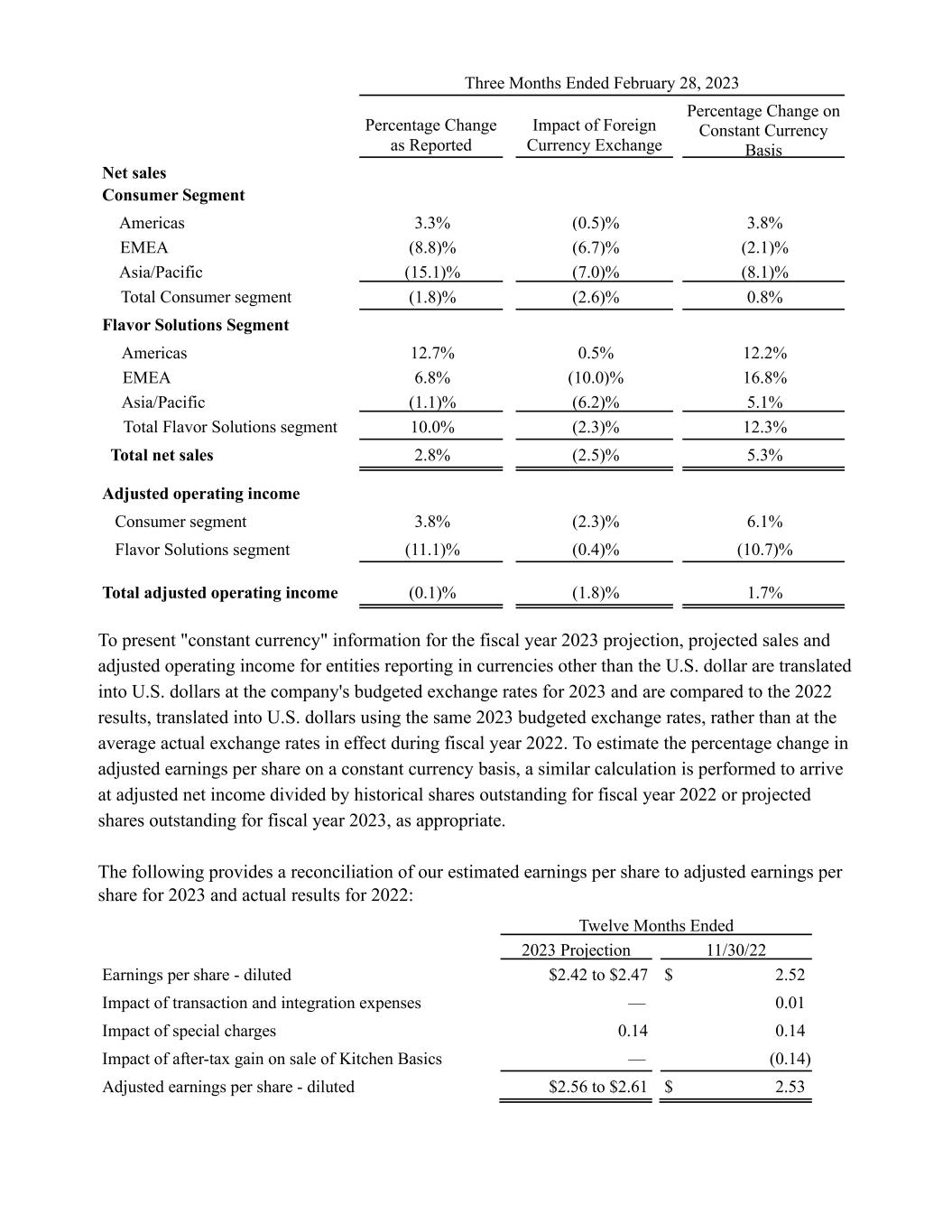 Three Months Ended February 28, 2023 Percentage Change as Reported Impact of Foreign Currency Exchange Percentage Change on Constant Currency Basis Net sales Consumer Segment Americas 3.3% (0.5)% 3.8% EMEA (8.8)% (6.7)% (2.1)% Asia/Pacific (15.1)% (7.0)% (8.1)% Total Consumer segment (1.8)% (2.6)% 0.8% Flavor Solutions Segment Americas 12.7% 0.5% 12.2% EMEA 6.8% (10.0)% 16.8% Asia/Pacific (1.1)% (6.2)% 5.1% Total Flavor Solutions segment 10.0% (2.3)% 12.3% Total net sales 2.8% (2.5)% 5.3% Adjusted operating income Consumer segment 3.8% (2.3)% 6.1% Flavor Solutions segment (11.1)% (0.4)% (10.7)% Total adjusted operating income (0.1)% (1.8)% 1.7% To present "constant currency" information for the fiscal year 2023 projection, projected sales and adjusted operating income for entities reporting in currencies other than the U.S. dollar are translated into U.S. dollars at the company's budgeted exchange rates for 2023 and are compared to the 2022 results, translated into U.S. dollars using the same 2023 budgeted exchange rates, rather than at the average actual exchange rates in effect during fiscal year 2022. To estimate the percentage change in adjusted earnings per share on a constant currency basis, a similar calculation is performed to arrive at adjusted net income divided by historical shares outstanding for fiscal year 2022 or projected shares outstanding for fiscal year 2023, as appropriate. The following provides a reconciliation of our estimated earnings per share to adjusted earnings per share for 2023 and actual results for 2022: Twelve Months Ended 2023 Projection 11/30/22 Earnings per share - diluted $2.42 to $2.47 $ 2.52 Impact of transaction and integration expenses — 0.01 Impact of special charges 0.14 0.14 Impact of after-tax gain on sale of Kitchen Basics — (0.14) Adjusted earnings per share - diluted $2.56 to $2.61 $ 2.53