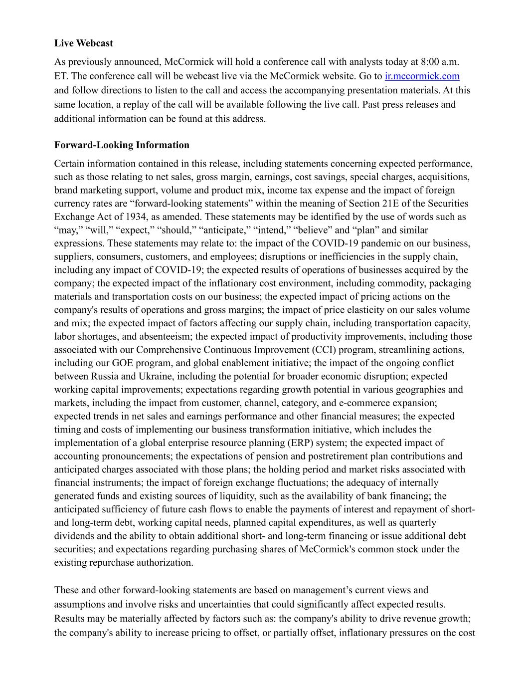 Live Webcast As previously announced, McCormick will hold a conference call with analysts today at 8:00 a.m. ET. The conference call will be webcast live via the McCormick website. Go to ir.mccormick.com and follow directions to listen to the call and access the accompanying presentation materials. At this same location, a replay of the call will be available following the live call. Past press releases and additional information can be found at this address. Forward-Looking Information Certain information contained in this release, including statements concerning expected performance, such as those relating to net sales, gross margin, earnings, cost savings, special charges, acquisitions, brand marketing support, volume and product mix, income tax expense and the impact of foreign currency rates are “forward-looking statements” within the meaning of Section 21E of the Securities Exchange Act of 1934, as amended. These statements may be identified by the use of words such as “may,” “will,” “expect,” “should,” “anticipate,” “intend,” “believe” and “plan” and similar expressions. These statements may relate to: the impact of the COVID-19 pandemic on our business, suppliers, consumers, customers, and employees; disruptions or inefficiencies in the supply chain, including any impact of COVID-19; the expected results of operations of businesses acquired by the company; the expected impact of the inflationary cost environment, including commodity, packaging materials and transportation costs on our business; the expected impact of pricing actions on the company's results of operations and gross margins; the impact of price elasticity on our sales volume and mix; the expected impact of factors affecting our supply chain, including transportation capacity, labor shortages, and absenteeism; the expected impact of productivity improvements, including those associated with our Comprehensive Continuous Improvement (CCI) program, streamlining actions, including our GOE program, and global enablement initiative; the impact of the ongoing conflict between Russia and Ukraine, including the potential for broader economic disruption; expected working capital improvements; expectations regarding growth potential in various geographies and markets, including the impact from customer, channel, category, and e-commerce expansion; expected trends in net sales and earnings performance and other financial measures; the expected timing and costs of implementing our business transformation initiative, which includes the implementation of a global enterprise resource planning (ERP) system; the expected impact of accounting pronouncements; the expectations of pension and postretirement plan contributions and anticipated charges associated with those plans; the holding period and market risks associated with financial instruments; the impact of foreign exchange fluctuations; the adequacy of internally generated funds and existing sources of liquidity, such as the availability of bank financing; the anticipated sufficiency of future cash flows to enable the payments of interest and repayment of short- and long-term debt, working capital needs, planned capital expenditures, as well as quarterly dividends and the ability to obtain additional short- and long-term financing or issue additional debt securities; and expectations regarding purchasing shares of McCormick's common stock under the existing repurchase authorization. These and other forward-looking statements are based on management’s current views and assumptions and involve risks and uncertainties that could significantly affect expected results. Results may be materially affected by factors such as: the company's ability to drive revenue growth; the company's ability to increase pricing to offset, or partially offset, inflationary pressures on the cost