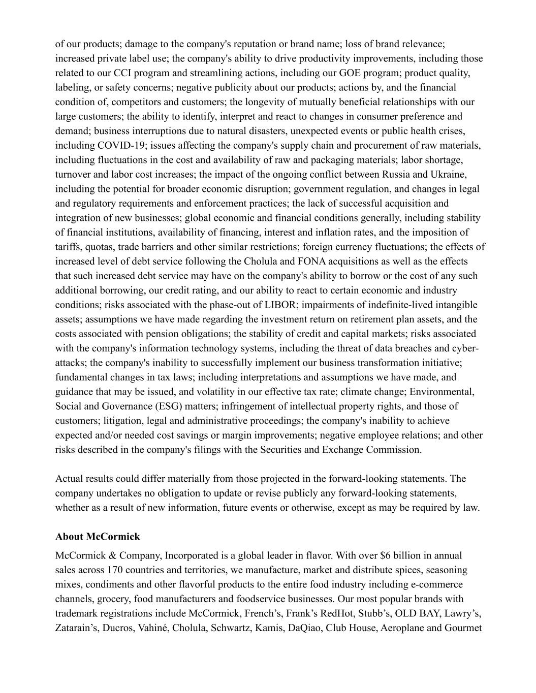 of our products; damage to the company's reputation or brand name; loss of brand relevance; increased private label use; the company's ability to drive productivity improvements, including those related to our CCI program and streamlining actions, including our GOE program; product quality, labeling, or safety concerns; negative publicity about our products; actions by, and the financial condition of, competitors and customers; the longevity of mutually beneficial relationships with our large customers; the ability to identify, interpret and react to changes in consumer preference and demand; business interruptions due to natural disasters, unexpected events or public health crises, including COVID-19; issues affecting the company's supply chain and procurement of raw materials, including fluctuations in the cost and availability of raw and packaging materials; labor shortage, turnover and labor cost increases; the impact of the ongoing conflict between Russia and Ukraine, including the potential for broader economic disruption; government regulation, and changes in legal and regulatory requirements and enforcement practices; the lack of successful acquisition and integration of new businesses; global economic and financial conditions generally, including stability of financial institutions, availability of financing, interest and inflation rates, and the imposition of tariffs, quotas, trade barriers and other similar restrictions; foreign currency fluctuations; the effects of increased level of debt service following the Cholula and FONA acquisitions as well as the effects that such increased debt service may have on the company's ability to borrow or the cost of any such additional borrowing, our credit rating, and our ability to react to certain economic and industry conditions; risks associated with the phase-out of LIBOR; impairments of indefinite-lived intangible assets; assumptions we have made regarding the investment return on retirement plan assets, and the costs associated with pension obligations; the stability of credit and capital markets; risks associated with the company's information technology systems, including the threat of data breaches and cyber- attacks; the company's inability to successfully implement our business transformation initiative; fundamental changes in tax laws; including interpretations and assumptions we have made, and guidance that may be issued, and volatility in our effective tax rate; climate change; Environmental, Social and Governance (ESG) matters; infringement of intellectual property rights, and those of customers; litigation, legal and administrative proceedings; the company's inability to achieve expected and/or needed cost savings or margin improvements; negative employee relations; and other risks described in the company's filings with the Securities and Exchange Commission. Actual results could differ materially from those projected in the forward-looking statements. The company undertakes no obligation to update or revise publicly any forward-looking statements, whether as a result of new information, future events or otherwise, except as may be required by law. About McCormick McCormick & Company, Incorporated is a global leader in flavor. With over $6 billion in annual sales across 170 countries and territories, we manufacture, market and distribute spices, seasoning mixes, condiments and other flavorful products to the entire food industry including e-commerce channels, grocery, food manufacturers and foodservice businesses. Our most popular brands with trademark registrations include McCormick, French’s, Frank’s RedHot, Stubb’s, OLD BAY, Lawry’s, Zatarain’s, Ducros, Vahiné, Cholula, Schwartz, Kamis, DaQiao, Club House, Aeroplane and Gourmet