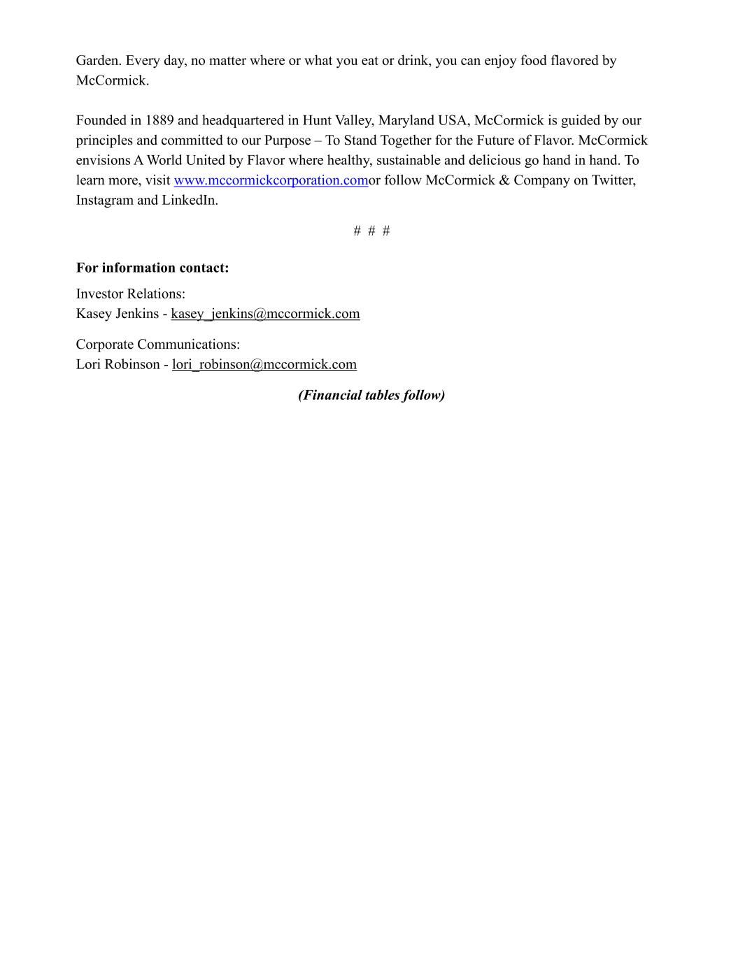 Garden. Every day, no matter where or what you eat or drink, you can enjoy food flavored by McCormick. Founded in 1889 and headquartered in Hunt Valley, Maryland USA, McCormick is guided by our principles and committed to our Purpose – To Stand Together for the Future of Flavor. McCormick envisions A World United by Flavor where healthy, sustainable and delicious go hand in hand. To learn more, visit www.mccormickcorporation.comor follow McCormick & Company on Twitter, Instagram and LinkedIn. # # # For information contact: Investor Relations: Kasey Jenkins - kasey_jenkins@mccormick.com Corporate Communications: Lori Robinson - lori_robinson@mccormick.com (Financial tables follow)