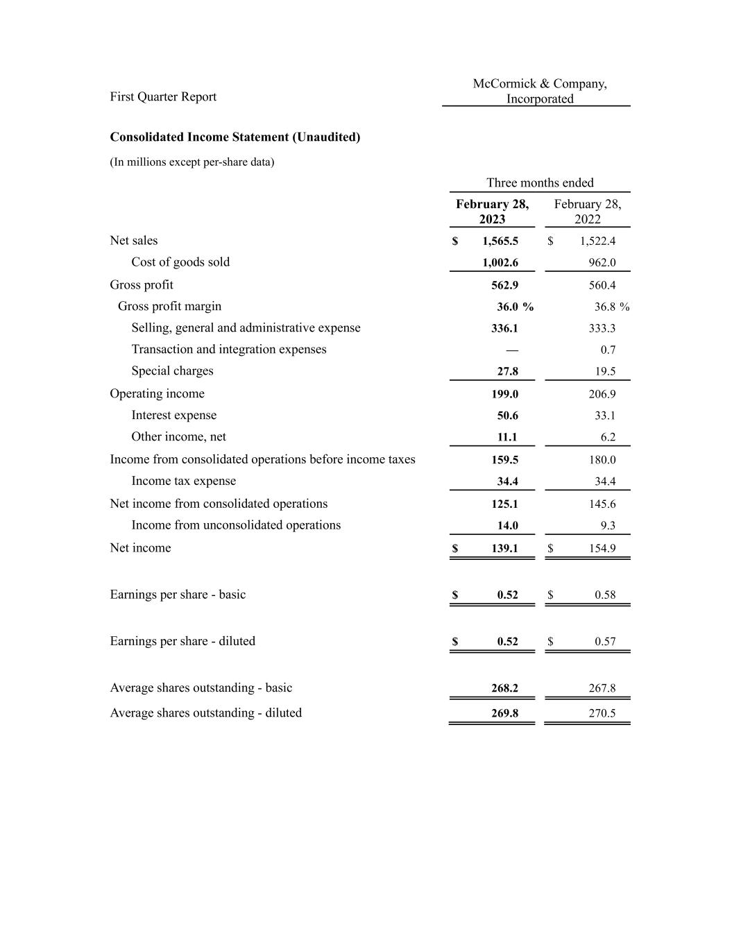 First Quarter Report McCormick & Company, Incorporated Consolidated Income Statement (Unaudited) (In millions except per-share data) Three months ended February 28, 2023 February 28, 2022 Net sales $ 1,565.5 $ 1,522.4 Cost of goods sold 1,002.6 962.0 Gross profit 562.9 560.4 Gross profit margin 36.0 % 36.8 % Selling, general and administrative expense 336.1 333.3 Transaction and integration expenses — 0.7 Special charges 27.8 19.5 Operating income 199.0 206.9 Interest expense 50.6 33.1 Other income, net 11.1 6.2 Income from consolidated operations before income taxes 159.5 180.0 Income tax expense 34.4 34.4 Net income from consolidated operations 125.1 145.6 Income from unconsolidated operations 14.0 9.3 Net income $ 139.1 $ 154.9 Earnings per share - basic $ 0.52 $ 0.58 Earnings per share - diluted $ 0.52 $ 0.57 Average shares outstanding - basic 268.2 267.8 Average shares outstanding - diluted 269.8 270.5