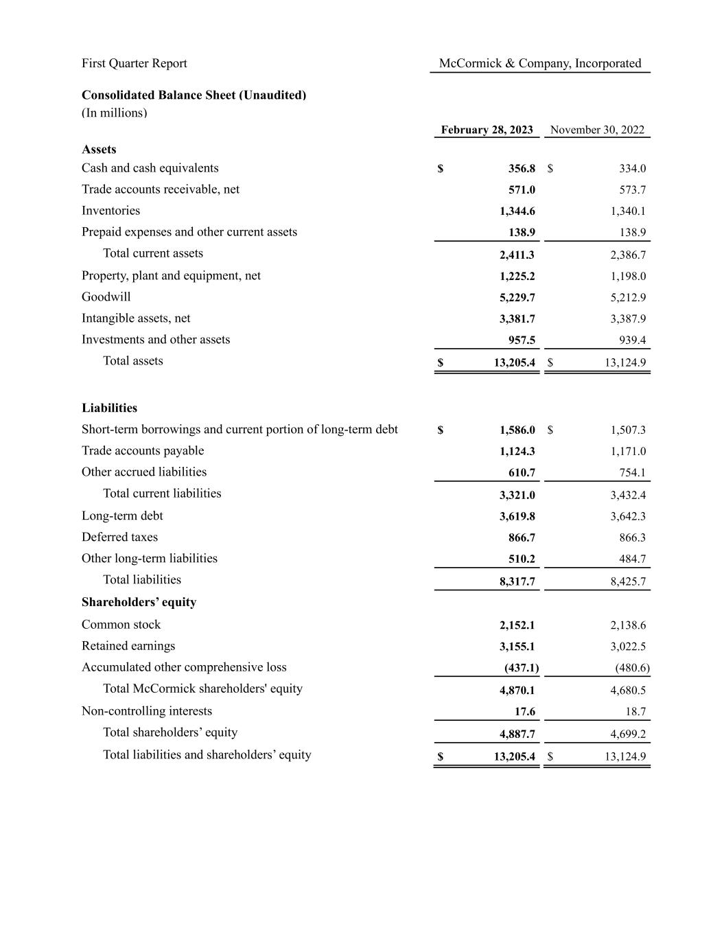 First Quarter Report McCormick & Company, Incorporated Consolidated Balance Sheet (Unaudited) (In millions) February 28, 2023 November 30, 2022 Assets Cash and cash equivalents $ 356.8 $ 334.0 Trade accounts receivable, net 571.0 573.7 Inventories 1,344.6 1,340.1 Prepaid expenses and other current assets 138.9 138.9 Total current assets 2,411.3 2,386.7 Property, plant and equipment, net 1,225.2 1,198.0 Goodwill 5,229.7 5,212.9 Intangible assets, net 3,381.7 3,387.9 Investments and other assets 957.5 939.4 Total assets $ 13,205.4 $ 13,124.9 Liabilities Short-term borrowings and current portion of long-term debt $ 1,586.0 $ 1,507.3 Trade accounts payable 1,124.3 1,171.0 Other accrued liabilities 610.7 754.1 Total current liabilities 3,321.0 3,432.4 Long-term debt 3,619.8 3,642.3 Deferred taxes 866.7 866.3 Other long-term liabilities 510.2 484.7 Total liabilities 8,317.7 8,425.7 Shareholders’ equity Common stock 2,152.1 2,138.6 Retained earnings 3,155.1 3,022.5 Accumulated other comprehensive loss (437.1) (480.6) Total McCormick shareholders' equity 4,870.1 4,680.5 Non-controlling interests 17.6 18.7 Total shareholders’ equity 4,887.7 4,699.2 Total liabilities and shareholders’ equity $ 13,205.4 $ 13,124.9