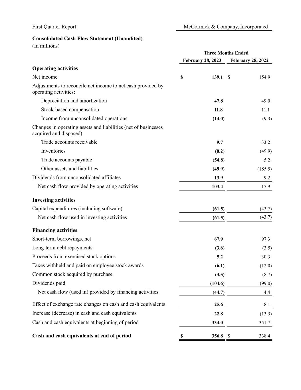 First Quarter Report McCormick & Company, Incorporated Consolidated Cash Flow Statement (Unaudited) (In millions) Three Months Ended February 28, 2023 February 28, 2022 Operating activities Net income $ 139.1 $ 154.9 Adjustments to reconcile net income to net cash provided by operating activities: Depreciation and amortization 47.8 49.0 Stock-based compensation 11.8 11.1 Income from unconsolidated operations (14.0) (9.3) Changes in operating assets and liabilities (net of businesses acquired and disposed) Trade accounts receivable 9.7 33.2 Inventories (0.2) (49.9) Trade accounts payable (54.8) 5.2 Other assets and liabilities (49.9) (185.5) Dividends from unconsolidated affiliates 13.9 9.2 Net cash flow provided by operating activities 103.4 17.9 Investing activities Capital expenditures (including software) (61.5) (43.7) Net cash flow used in investing activities (61.5) (43.7) Financing activities Short-term borrowings, net 67.9 97.3 Long-term debt repayments (3.6) (3.5) Proceeds from exercised stock options 5.2 30.3 Taxes withheld and paid on employee stock awards (6.1) (12.0) Common stock acquired by purchase (3.5) (8.7) Dividends paid (104.6) (99.0) Net cash flow (used in) provided by financing activities (44.7) 4.4 Effect of exchange rate changes on cash and cash equivalents 25.6 8.1 Increase (decrease) in cash and cash equivalents 22.8 (13.3) Cash and cash equivalents at beginning of period 334.0 351.7 Cash and cash equivalents at end of period $ 356.8 $ 338.4