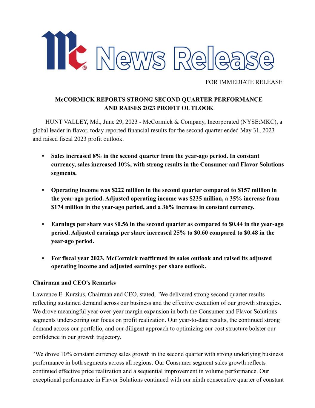 FOR IMMEDIATE RELEASE McCORMICK REPORTS STRONG SECOND QUARTER PERFORMANCE AND RAISES 2023 PROFIT OUTLOOK HUNT VALLEY, Md., June 29, 2023 - McCormick & Company, Incorporated (NYSE:MKC), a global leader in flavor, today reported financial results for the second quarter ended May 31, 2023 and raised fiscal 2023 profit outlook. • Sales increased 8% in the second quarter from the year-ago period. In constant currency, sales increased 10%, with strong results in the Consumer and Flavor Solutions segments. • Operating income was $222 million in the second quarter compared to $157 million in the year-ago period. Adjusted operating income was $235 million, a 35% increase from $174 million in the year-ago period, and a 36% increase in constant currency. • Earnings per share was $0.56 in the second quarter as compared to $0.44 in the year-ago period. Adjusted earnings per share increased 25% to $0.60 compared to $0.48 in the year-ago period. • For fiscal year 2023, McCormick reaffirmed its sales outlook and raised its adjusted operating income and adjusted earnings per share outlook. Chairman and CEO's Remarks Lawrence E. Kurzius, Chairman and CEO, stated, "We delivered strong second quarter results reflecting sustained demand across our business and the effective execution of our growth strategies. We drove meaningful year-over-year margin expansion in both the Consumer and Flavor Solutions segments underscoring our focus on profit realization. Our year-to-date results, the continued strong demand across our portfolio, and our diligent approach to optimizing our cost structure bolster our confidence in our growth trajectory. “We drove 10% constant currency sales growth in the second quarter with strong underlying business performance in both segments across all regions. Our Consumer segment sales growth reflects continued effective price realization and a sequential improvement in volume performance. Our exceptional performance in Flavor Solutions continued with our ninth consecutive quarter of constant