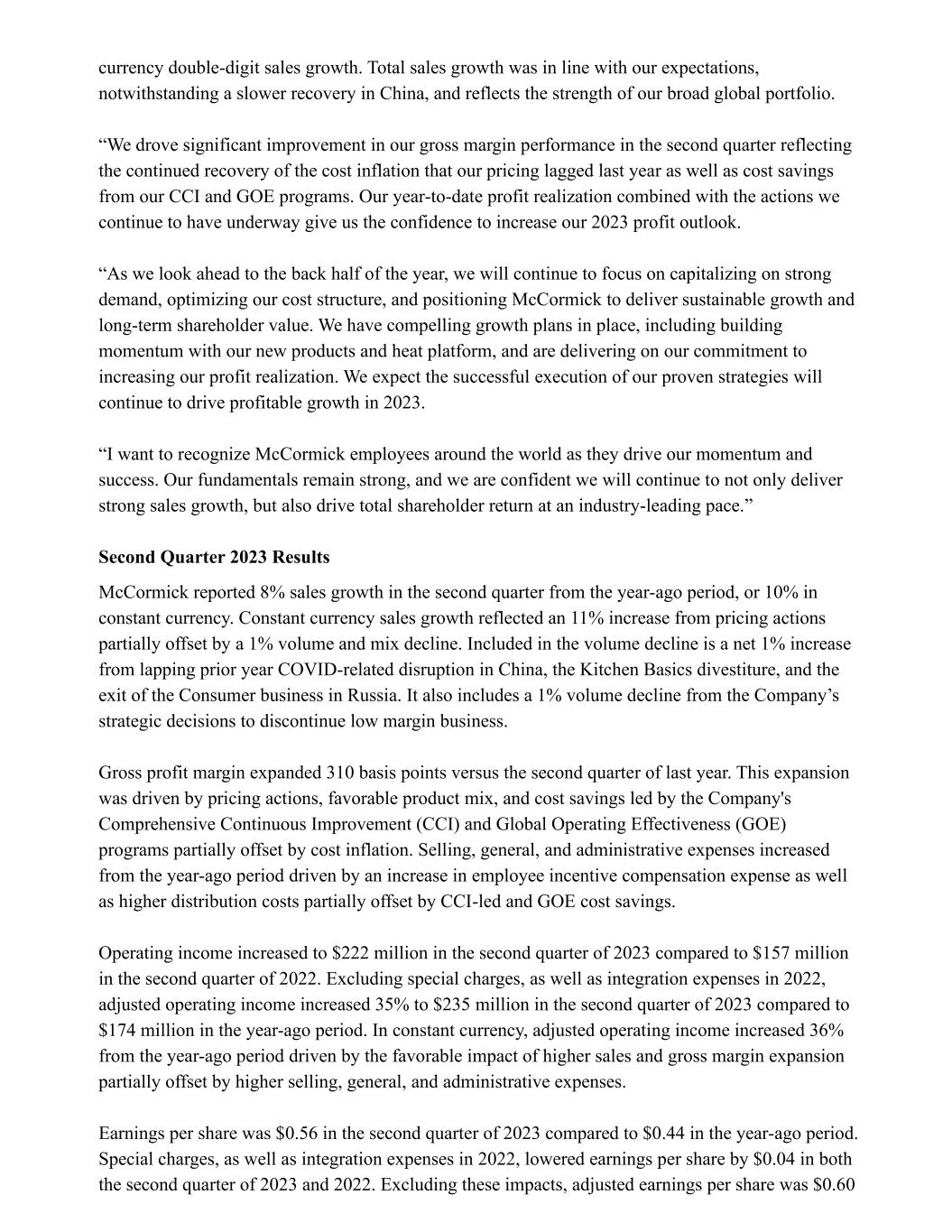 currency double-digit sales growth. Total sales growth was in line with our expectations, notwithstanding a slower recovery in China, and reflects the strength of our broad global portfolio. “We drove significant improvement in our gross margin performance in the second quarter reflecting the continued recovery of the cost inflation that our pricing lagged last year as well as cost savings from our CCI and GOE programs. Our year-to-date profit realization combined with the actions we continue to have underway give us the confidence to increase our 2023 profit outlook. “As we look ahead to the back half of the year, we will continue to focus on capitalizing on strong demand, optimizing our cost structure, and positioning McCormick to deliver sustainable growth and long-term shareholder value. We have compelling growth plans in place, including building momentum with our new products and heat platform, and are delivering on our commitment to increasing our profit realization. We expect the successful execution of our proven strategies will continue to drive profitable growth in 2023. “I want to recognize McCormick employees around the world as they drive our momentum and success. Our fundamentals remain strong, and we are confident we will continue to not only deliver strong sales growth, but also drive total shareholder return at an industry-leading pace.” Second Quarter 2023 Results McCormick reported 8% sales growth in the second quarter from the year-ago period, or 10% in constant currency. Constant currency sales growth reflected an 11% increase from pricing actions partially offset by a 1% volume and mix decline. Included in the volume decline is a net 1% increase from lapping prior year COVID-related disruption in China, the Kitchen Basics divestiture, and the exit of the Consumer business in Russia. It also includes a 1% volume decline from the Company’s strategic decisions to discontinue low margin business. Gross profit margin expanded 310 basis points versus the second quarter of last year. This expansion was driven by pricing actions, favorable product mix, and cost savings led by the Company's Comprehensive Continuous Improvement (CCI) and Global Operating Effectiveness (GOE) programs partially offset by cost inflation. Selling, general, and administrative expenses increased from the year-ago period driven by an increase in employee incentive compensation expense as well as higher distribution costs partially offset by CCI-led and GOE cost savings. Operating income increased to $222 million in the second quarter of 2023 compared to $157 million in the second quarter of 2022. Excluding special charges, as well as integration expenses in 2022, adjusted operating income increased 35% to $235 million in the second quarter of 2023 compared to $174 million in the year-ago period. In constant currency, adjusted operating income increased 36% from the year-ago period driven by the favorable impact of higher sales and gross margin expansion partially offset by higher selling, general, and administrative expenses. Earnings per share was $0.56 in the second quarter of 2023 compared to $0.44 in the year-ago period. Special charges, as well as integration expenses in 2022, lowered earnings per share by $0.04 in both the second quarter of 2023 and 2022. Excluding these impacts, adjusted earnings per share was $0.60