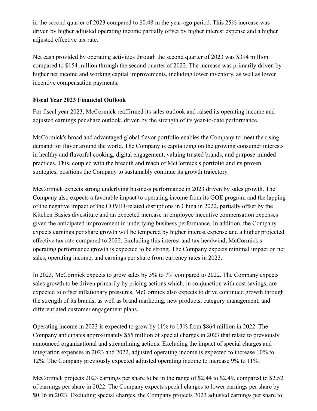 in the second quarter of 2023 compared to $0.48 in the year-ago period. This 25% increase was driven by higher adjusted operating income partially offset by higher interest expense and a higher adjusted effective tax rate. Net cash provided by operating activities through the second quarter of 2023 was $394 million compared to $154 million through the second quarter of 2022. The increase was primarily driven by higher net income and working capital improvements, including lower inventory, as well as lower incentive compensation payments. Fiscal Year 2023 Financial Outlook For fiscal year 2023, McCormick reaffirmed its sales outlook and raised its operating income and adjusted earnings per share outlook, driven by the strength of its year-to-date performance. McCormick's broad and advantaged global flavor portfolio enables the Company to meet the rising demand for flavor around the world. The Company is capitalizing on the growing consumer interests in healthy and flavorful cooking, digital engagement, valuing trusted brands, and purpose-minded practices. This, coupled with the breadth and reach of McCormick's portfolio and its proven strategies, positions the Company to sustainably continue its growth trajectory. McCormick expects strong underlying business performance in 2023 driven by sales growth. The Company also expects a favorable impact to operating income from its GOE program and the lapping of the negative impact of the COVID-related disruptions in China in 2022, partially offset by the Kitchen Basics divestiture and an expected increase in employee incentive compensation expenses given the anticipated improvement in underlying business performance. In addition, the Company expects earnings per share growth will be tempered by higher interest expense and a higher projected effective tax rate compared to 2022. Excluding this interest and tax headwind, McCormick's operating performance growth is expected to be strong. The Company expects minimal impact on net sales, operating income, and earnings per share from currency rates in 2023. In 2023, McCormick expects to grow sales by 5% to 7% compared to 2022. The Company expects sales growth to be driven primarily by pricing actions which, in conjunction with cost savings, are expected to offset inflationary pressures. McCormick also expects to drive continued growth through the strength of its brands, as well as brand marketing, new products, category management, and differentiated customer engagement plans. Operating income in 2023 is expected to grow by 11% to 13% from $864 million in 2022. The Company anticipates approximately $55 million of special charges in 2023 that relate to previously announced organizational and streamlining actions. Excluding the impact of special charges and integration expenses in 2023 and 2022, adjusted operating income is expected to increase 10% to 12%. The Company previously expected adjusted operating income to increase 9% to 11%. McCormick projects 2023 earnings per share to be in the range of $2.44 to $2.49, compared to $2.52 of earnings per share in 2022. The Company expects special charges to lower earnings per share by $0.16 in 2023. Excluding special charges, the Company projects 2023 adjusted earnings per share to