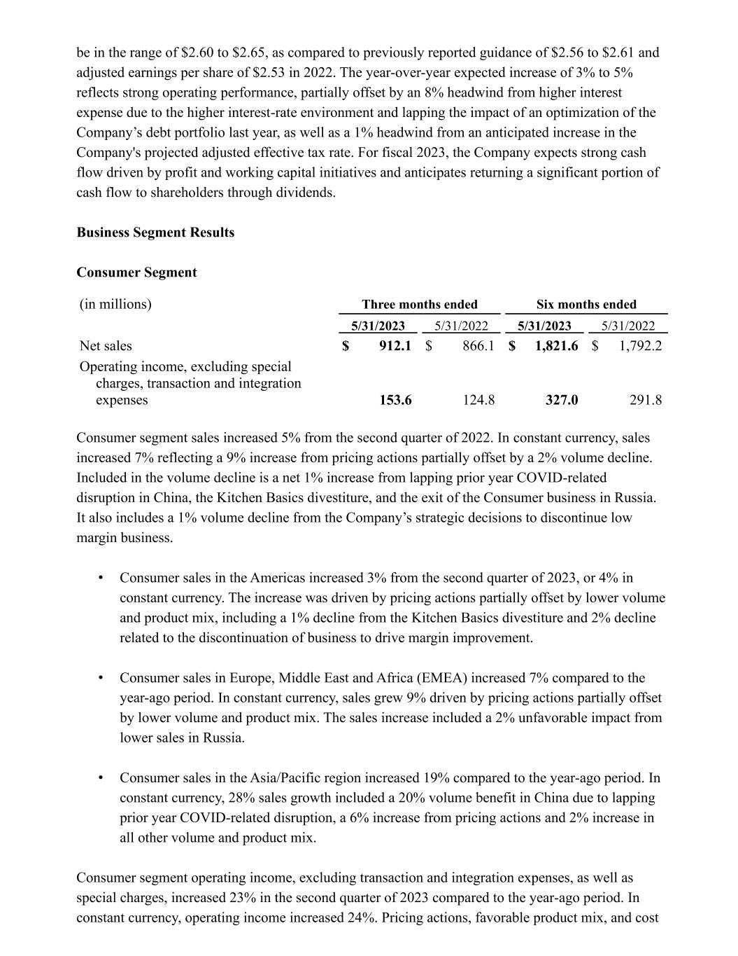 be in the range of $2.60 to $2.65, as compared to previously reported guidance of $2.56 to $2.61 and adjusted earnings per share of $2.53 in 2022. The year-over-year expected increase of 3% to 5% reflects strong operating performance, partially offset by an 8% headwind from higher interest expense due to the higher interest-rate environment and lapping the impact of an optimization of the Company’s debt portfolio last year, as well as a 1% headwind from an anticipated increase in the Company's projected adjusted effective tax rate. For fiscal 2023, the Company expects strong cash flow driven by profit and working capital initiatives and anticipates returning a significant portion of cash flow to shareholders through dividends. Business Segment Results Consumer Segment (in millions) Three months ended Six months ended 5/31/2023 5/31/2022 5/31/2023 5/31/2022 Net sales $ 912.1 $ 866.1 $ 1,821.6 $ 1,792.2 Operating income, excluding special charges, transaction and integration expenses 153.6 124.8 327.0 291.8 Consumer segment sales increased 5% from the second quarter of 2022. In constant currency, sales increased 7% reflecting a 9% increase from pricing actions partially offset by a 2% volume decline. Included in the volume decline is a net 1% increase from lapping prior year COVID-related disruption in China, the Kitchen Basics divestiture, and the exit of the Consumer business in Russia. It also includes a 1% volume decline from the Company’s strategic decisions to discontinue low margin business. • Consumer sales in the Americas increased 3% from the second quarter of 2023, or 4% in constant currency. The increase was driven by pricing actions partially offset by lower volume and product mix, including a 1% decline from the Kitchen Basics divestiture and 2% decline related to the discontinuation of business to drive margin improvement. • Consumer sales in Europe, Middle East and Africa (EMEA) increased 7% compared to the year-ago period. In constant currency, sales grew 9% driven by pricing actions partially offset by lower volume and product mix. The sales increase included a 2% unfavorable impact from lower sales in Russia. • Consumer sales in the Asia/Pacific region increased 19% compared to the year-ago period. In constant currency, 28% sales growth included a 20% volume benefit in China due to lapping prior year COVID-related disruption, a 6% increase from pricing actions and 2% increase in all other volume and product mix. Consumer segment operating income, excluding transaction and integration expenses, as well as special charges, increased 23% in the second quarter of 2023 compared to the year-ago period. In constant currency, operating income increased 24%. Pricing actions, favorable product mix, and cost