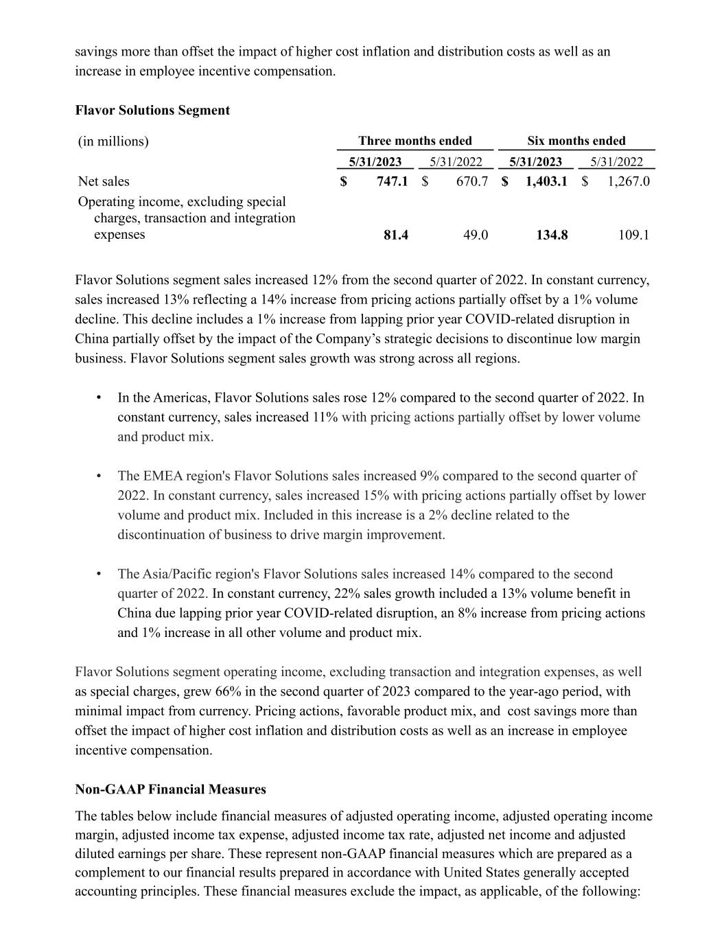 savings more than offset the impact of higher cost inflation and distribution costs as well as an increase in employee incentive compensation. Flavor Solutions Segment (in millions) Three months ended Six months ended 5/31/2023 5/31/2022 5/31/2023 5/31/2022 Net sales $ 747.1 $ 670.7 $ 1,403.1 $ 1,267.0 Operating income, excluding special charges, transaction and integration expenses 81.4 49.0 134.8 109.1 Flavor Solutions segment sales increased 12% from the second quarter of 2022. In constant currency, sales increased 13% reflecting a 14% increase from pricing actions partially offset by a 1% volume decline. This decline includes a 1% increase from lapping prior year COVID-related disruption in China partially offset by the impact of the Company’s strategic decisions to discontinue low margin business. Flavor Solutions segment sales growth was strong across all regions. • In the Americas, Flavor Solutions sales rose 12% compared to the second quarter of 2022. In constant currency, sales increased 11% with pricing actions partially offset by lower volume and product mix. • The EMEA region's Flavor Solutions sales increased 9% compared to the second quarter of 2022. In constant currency, sales increased 15% with pricing actions partially offset by lower volume and product mix. Included in this increase is a 2% decline related to the discontinuation of business to drive margin improvement. • The Asia/Pacific region's Flavor Solutions sales increased 14% compared to the second quarter of 2022. In constant currency, 22% sales growth included a 13% volume benefit in China due lapping prior year COVID-related disruption, an 8% increase from pricing actions and 1% increase in all other volume and product mix. Flavor Solutions segment operating income, excluding transaction and integration expenses, as well as special charges, grew 66% in the second quarter of 2023 compared to the year-ago period, with minimal impact from currency. Pricing actions, favorable product mix, and cost savings more than offset the impact of higher cost inflation and distribution costs as well as an increase in employee incentive compensation. Non-GAAP Financial Measures The tables below include financial measures of adjusted operating income, adjusted operating income margin, adjusted income tax expense, adjusted income tax rate, adjusted net income and adjusted diluted earnings per share. These represent non-GAAP financial measures which are prepared as a complement to our financial results prepared in accordance with United States generally accepted accounting principles. These financial measures exclude the impact, as applicable, of the following: