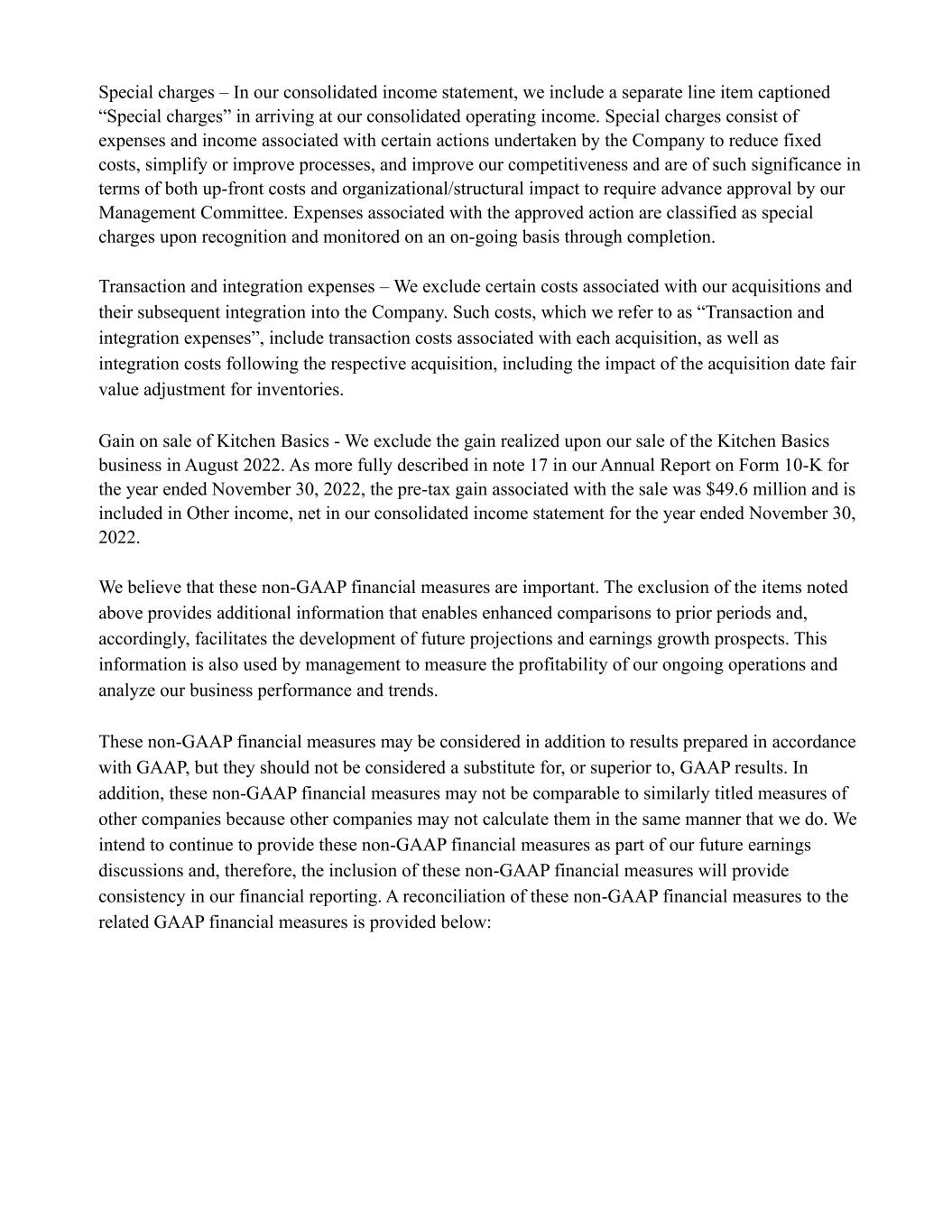 Special charges – In our consolidated income statement, we include a separate line item captioned “Special charges” in arriving at our consolidated operating income. Special charges consist of expenses and income associated with certain actions undertaken by the Company to reduce fixed costs, simplify or improve processes, and improve our competitiveness and are of such significance in terms of both up-front costs and organizational/structural impact to require advance approval by our Management Committee. Expenses associated with the approved action are classified as special charges upon recognition and monitored on an on-going basis through completion. Transaction and integration expenses – We exclude certain costs associated with our acquisitions and their subsequent integration into the Company. Such costs, which we refer to as “Transaction and integration expenses”, include transaction costs associated with each acquisition, as well as integration costs following the respective acquisition, including the impact of the acquisition date fair value adjustment for inventories. Gain on sale of Kitchen Basics - We exclude the gain realized upon our sale of the Kitchen Basics business in August 2022. As more fully described in note 17 in our Annual Report on Form 10-K for the year ended November 30, 2022, the pre-tax gain associated with the sale was $49.6 million and is included in Other income, net in our consolidated income statement for the year ended November 30, 2022. We believe that these non-GAAP financial measures are important. The exclusion of the items noted above provides additional information that enables enhanced comparisons to prior periods and, accordingly, facilitates the development of future projections and earnings growth prospects. This information is also used by management to measure the profitability of our ongoing operations and analyze our business performance and trends. These non-GAAP financial measures may be considered in addition to results prepared in accordance with GAAP, but they should not be considered a substitute for, or superior to, GAAP results. In addition, these non-GAAP financial measures may not be comparable to similarly titled measures of other companies because other companies may not calculate them in the same manner that we do. We intend to continue to provide these non-GAAP financial measures as part of our future earnings discussions and, therefore, the inclusion of these non-GAAP financial measures will provide consistency in our financial reporting. A reconciliation of these non-GAAP financial measures to the related GAAP financial measures is provided below: