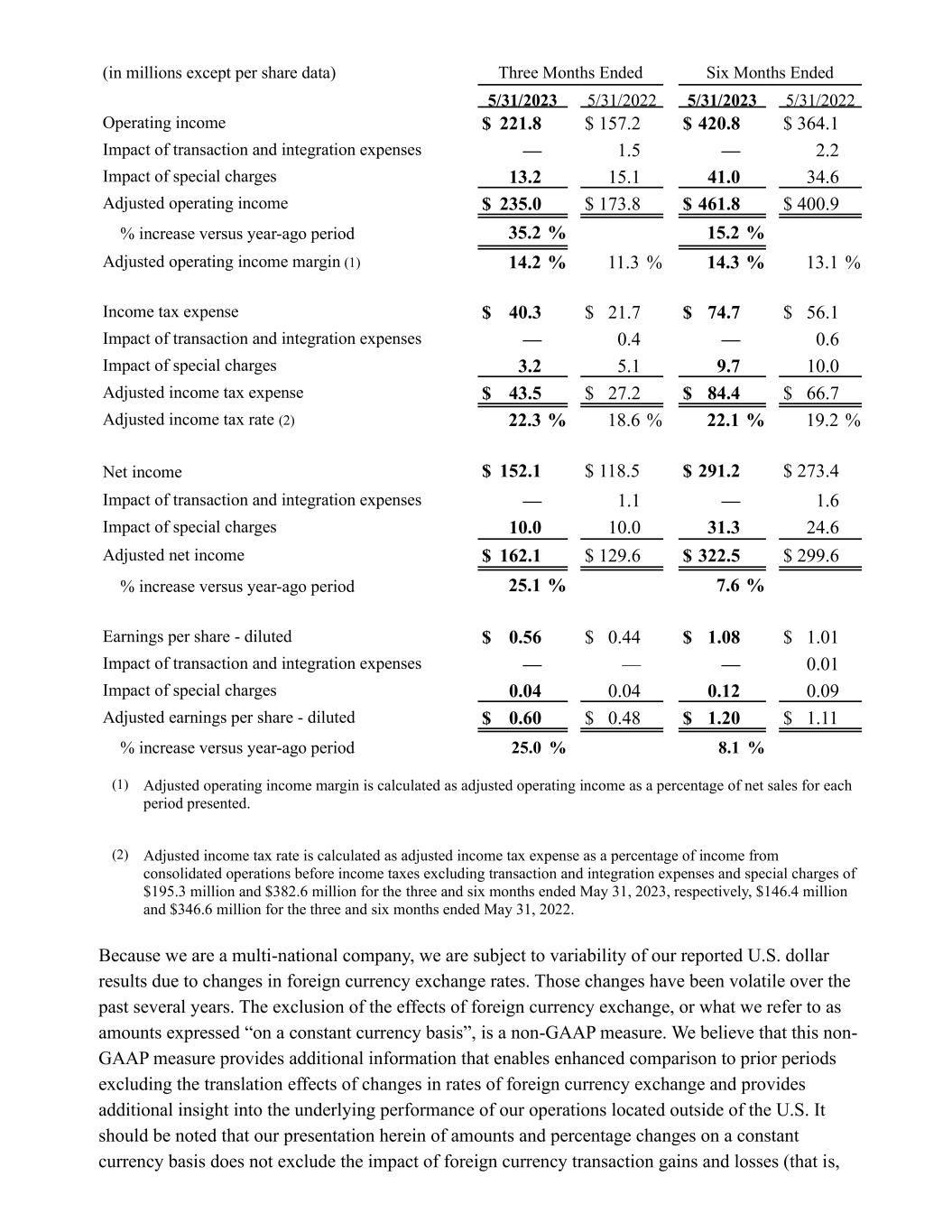 (in millions except per share data) Three Months Ended Six Months Ended 5/31/2023 5/31/2022 5/31/2023 5/31/2022 Operating income $ 221.8 $ 157.2 $ 420.8 $ 364.1 Impact of transaction and integration expenses — 1.5 — 2.2 Impact of special charges 13.2 15.1 41.0 34.6 Adjusted operating income $ 235.0 $ 173.8 $ 461.8 $ 400.9 % increase versus year-ago period 35.2 % 15.2 % Adjusted operating income margin (1) 14.2 % 11.3 % 14.3 % 13.1 % Income tax expense $ 40.3 $ 21.7 $ 74.7 $ 56.1 Impact of transaction and integration expenses — 0.4 — 0.6 Impact of special charges 3.2 5.1 9.7 10.0 Adjusted income tax expense $ 43.5 $ 27.2 $ 84.4 $ 66.7 Adjusted income tax rate (2) 22.3 % 18.6 % 22.1 % 19.2 % Net income $ 152.1 $ 118.5 $ 291.2 $ 273.4 Impact of transaction and integration expenses — 1.1 — 1.6 Impact of special charges 10.0 10.0 31.3 24.6 Adjusted net income $ 162.1 $ 129.6 $ 322.5 $ 299.6 % increase versus year-ago period 25.1 % 7.6 % Earnings per share - diluted $ 0.56 $ 0.44 $ 1.08 $ 1.01 Impact of transaction and integration expenses — — — 0.01 Impact of special charges 0.04 0.04 0.12 0.09 Adjusted earnings per share - diluted $ 0.60 $ 0.48 $ 1.20 $ 1.11 % increase versus year-ago period 25.0 % 8.1 % (1) Adjusted operating income margin is calculated as adjusted operating income as a percentage of net sales for each period presented. (2) Adjusted income tax rate is calculated as adjusted income tax expense as a percentage of income from consolidated operations before income taxes excluding transaction and integration expenses and special charges of $195.3 million and $382.6 million for the three and six months ended May 31, 2023, respectively, $146.4 million and $346.6 million for the three and six months ended May 31, 2022. Because we are a multi-national company, we are subject to variability of our reported U.S. dollar results due to changes in foreign currency exchange rates. Those changes have been volatile over the past several years. The exclusion of the effects of foreign currency exchange, or what we refer to as amounts expressed “on a constant currency basis”, is a non-GAAP measure. We believe that this non- GAAP measure provides additional information that enables enhanced comparison to prior periods excluding the translation effects of changes in rates of foreign currency exchange and provides additional insight into the underlying performance of our operations located outside of the U.S. It should be noted that our presentation herein of amounts and percentage changes on a constant currency basis does not exclude the impact of foreign currency transaction gains and losses (that is,