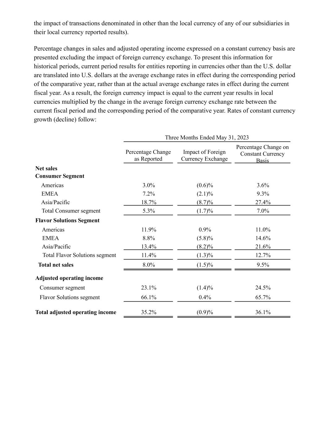 the impact of transactions denominated in other than the local currency of any of our subsidiaries in their local currency reported results). Percentage changes in sales and adjusted operating income expressed on a constant currency basis are presented excluding the impact of foreign currency exchange. To present this information for historical periods, current period results for entities reporting in currencies other than the U.S. dollar are translated into U.S. dollars at the average exchange rates in effect during the corresponding period of the comparative year, rather than at the actual average exchange rates in effect during the current fiscal year. As a result, the foreign currency impact is equal to the current year results in local currencies multiplied by the change in the average foreign currency exchange rate between the current fiscal period and the corresponding period of the comparative year. Rates of constant currency growth (decline) follow: Three Months Ended May 31, 2023 Percentage Change as Reported Impact of Foreign Currency Exchange Percentage Change on Constant Currency Basis Net sales Consumer Segment Americas 3.0% (0.6)% 3.6% EMEA 7.2% (2.1)% 9.3% Asia/Pacific 18.7% (8.7)% 27.4% Total Consumer segment 5.3% (1.7)% 7.0% Flavor Solutions Segment Americas 11.9% 0.9% 11.0% EMEA 8.8% (5.8)% 14.6% Asia/Pacific 13.4% (8.2)% 21.6% Total Flavor Solutions segment 11.4% (1.3)% 12.7% Total net sales 8.0% (1.5)% 9.5% Adjusted operating income Consumer segment 23.1% (1.4)% 24.5% Flavor Solutions segment 66.1% 0.4% 65.7% Total adjusted operating income 35.2% (0.9)% 36.1%