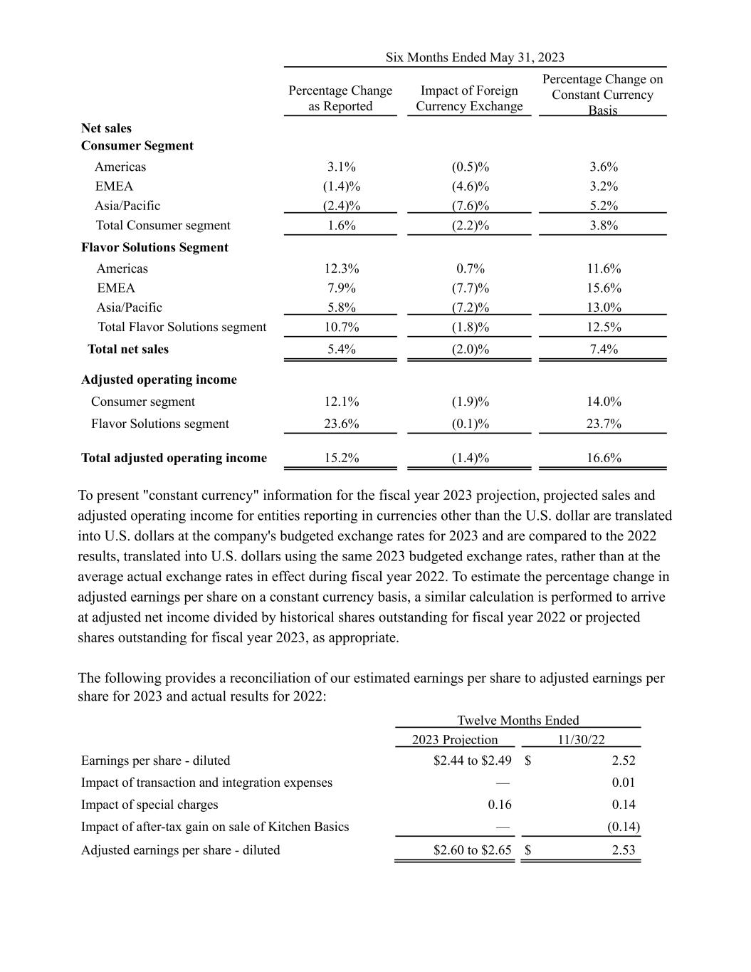 Six Months Ended May 31, 2023 Percentage Change as Reported Impact of Foreign Currency Exchange Percentage Change on Constant Currency Basis Net sales Consumer Segment Americas 3.1% (0.5)% 3.6% EMEA (1.4)% (4.6)% 3.2% Asia/Pacific (2.4)% (7.6)% 5.2% Total Consumer segment 1.6% (2.2)% 3.8% Flavor Solutions Segment Americas 12.3% 0.7% 11.6% EMEA 7.9% (7.7)% 15.6% Asia/Pacific 5.8% (7.2)% 13.0% Total Flavor Solutions segment 10.7% (1.8)% 12.5% Total net sales 5.4% (2.0)% 7.4% Adjusted operating income Consumer segment 12.1% (1.9)% 14.0% Flavor Solutions segment 23.6% (0.1)% 23.7% Total adjusted operating income 15.2% (1.4)% 16.6% To present "constant currency" information for the fiscal year 2023 projection, projected sales and adjusted operating income for entities reporting in currencies other than the U.S. dollar are translated into U.S. dollars at the company's budgeted exchange rates for 2023 and are compared to the 2022 results, translated into U.S. dollars using the same 2023 budgeted exchange rates, rather than at the average actual exchange rates in effect during fiscal year 2022. To estimate the percentage change in adjusted earnings per share on a constant currency basis, a similar calculation is performed to arrive at adjusted net income divided by historical shares outstanding for fiscal year 2022 or projected shares outstanding for fiscal year 2023, as appropriate. The following provides a reconciliation of our estimated earnings per share to adjusted earnings per share for 2023 and actual results for 2022: Twelve Months Ended 2023 Projection 11/30/22 Earnings per share - diluted $2.44 to $2.49 $ 2.52 Impact of transaction and integration expenses — 0.01 Impact of special charges 0.16 0.14 Impact of after-tax gain on sale of Kitchen Basics — (0.14) Adjusted earnings per share - diluted $2.60 to $2.65 $ 2.53
