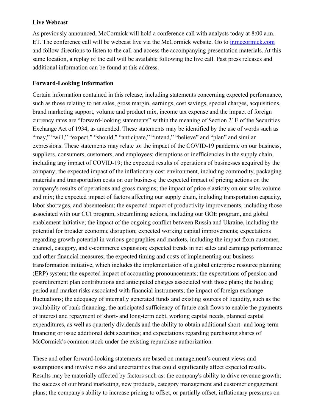 Live Webcast As previously announced, McCormick will hold a conference call with analysts today at 8:00 a.m. ET. The conference call will be webcast live via the McCormick website. Go to ir.mccormick.com and follow directions to listen to the call and access the accompanying presentation materials. At this same location, a replay of the call will be available following the live call. Past press releases and additional information can be found at this address. Forward-Looking Information Certain information contained in this release, including statements concerning expected performance, such as those relating to net sales, gross margin, earnings, cost savings, special charges, acquisitions, brand marketing support, volume and product mix, income tax expense and the impact of foreign currency rates are “forward-looking statements” within the meaning of Section 21E of the Securities Exchange Act of 1934, as amended. These statements may be identified by the use of words such as “may,” “will,” “expect,” “should,” “anticipate,” “intend,” “believe” and “plan” and similar expressions. These statements may relate to: the impact of the COVID-19 pandemic on our business, suppliers, consumers, customers, and employees; disruptions or inefficiencies in the supply chain, including any impact of COVID-19; the expected results of operations of businesses acquired by the company; the expected impact of the inflationary cost environment, including commodity, packaging materials and transportation costs on our business; the expected impact of pricing actions on the company's results of operations and gross margins; the impact of price elasticity on our sales volume and mix; the expected impact of factors affecting our supply chain, including transportation capacity, labor shortages, and absenteeism; the expected impact of productivity improvements, including those associated with our CCI program, streamlining actions, including our GOE program, and global enablement initiative; the impact of the ongoing conflict between Russia and Ukraine, including the potential for broader economic disruption; expected working capital improvements; expectations regarding growth potential in various geographies and markets, including the impact from customer, channel, category, and e-commerce expansion; expected trends in net sales and earnings performance and other financial measures; the expected timing and costs of implementing our business transformation initiative, which includes the implementation of a global enterprise resource planning (ERP) system; the expected impact of accounting pronouncements; the expectations of pension and postretirement plan contributions and anticipated charges associated with those plans; the holding period and market risks associated with financial instruments; the impact of foreign exchange fluctuations; the adequacy of internally generated funds and existing sources of liquidity, such as the availability of bank financing; the anticipated sufficiency of future cash flows to enable the payments of interest and repayment of short- and long-term debt, working capital needs, planned capital expenditures, as well as quarterly dividends and the ability to obtain additional short- and long-term financing or issue additional debt securities; and expectations regarding purchasing shares of McCormick's common stock under the existing repurchase authorization. These and other forward-looking statements are based on management’s current views and assumptions and involve risks and uncertainties that could significantly affect expected results. Results may be materially affected by factors such as: the company's ability to drive revenue growth; the success of our brand marketing, new products, category management and customer engagement plans; the company's ability to increase pricing to offset, or partially offset, inflationary pressures on