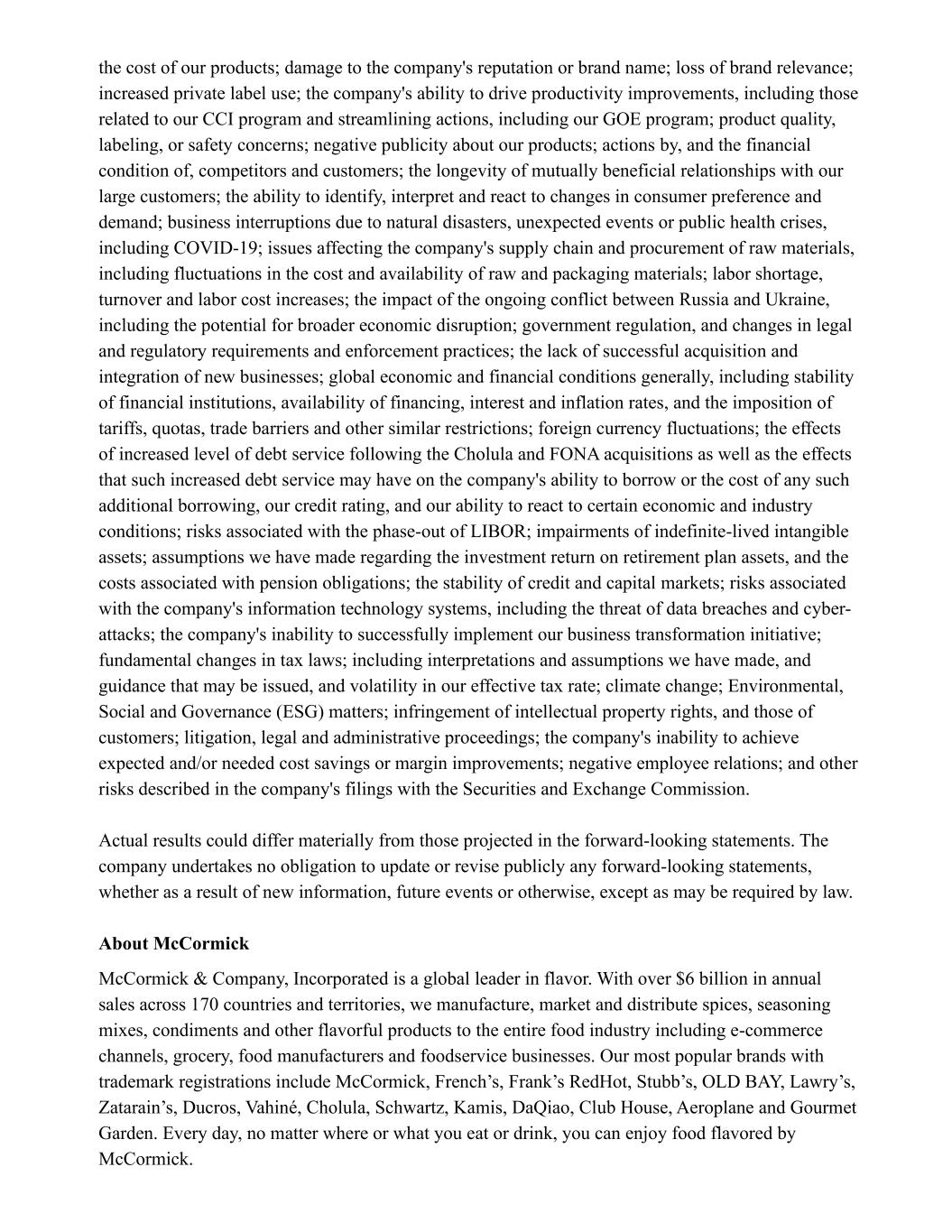 the cost of our products; damage to the company's reputation or brand name; loss of brand relevance; increased private label use; the company's ability to drive productivity improvements, including those related to our CCI program and streamlining actions, including our GOE program; product quality, labeling, or safety concerns; negative publicity about our products; actions by, and the financial condition of, competitors and customers; the longevity of mutually beneficial relationships with our large customers; the ability to identify, interpret and react to changes in consumer preference and demand; business interruptions due to natural disasters, unexpected events or public health crises, including COVID-19; issues affecting the company's supply chain and procurement of raw materials, including fluctuations in the cost and availability of raw and packaging materials; labor shortage, turnover and labor cost increases; the impact of the ongoing conflict between Russia and Ukraine, including the potential for broader economic disruption; government regulation, and changes in legal and regulatory requirements and enforcement practices; the lack of successful acquisition and integration of new businesses; global economic and financial conditions generally, including stability of financial institutions, availability of financing, interest and inflation rates, and the imposition of tariffs, quotas, trade barriers and other similar restrictions; foreign currency fluctuations; the effects of increased level of debt service following the Cholula and FONA acquisitions as well as the effects that such increased debt service may have on the company's ability to borrow or the cost of any such additional borrowing, our credit rating, and our ability to react to certain economic and industry conditions; risks associated with the phase-out of LIBOR; impairments of indefinite-lived intangible assets; assumptions we have made regarding the investment return on retirement plan assets, and the costs associated with pension obligations; the stability of credit and capital markets; risks associated with the company's information technology systems, including the threat of data breaches and cyber- attacks; the company's inability to successfully implement our business transformation initiative; fundamental changes in tax laws; including interpretations and assumptions we have made, and guidance that may be issued, and volatility in our effective tax rate; climate change; Environmental, Social and Governance (ESG) matters; infringement of intellectual property rights, and those of customers; litigation, legal and administrative proceedings; the company's inability to achieve expected and/or needed cost savings or margin improvements; negative employee relations; and other risks described in the company's filings with the Securities and Exchange Commission. Actual results could differ materially from those projected in the forward-looking statements. The company undertakes no obligation to update or revise publicly any forward-looking statements, whether as a result of new information, future events or otherwise, except as may be required by law. About McCormick McCormick & Company, Incorporated is a global leader in flavor. With over $6 billion in annual sales across 170 countries and territories, we manufacture, market and distribute spices, seasoning mixes, condiments and other flavorful products to the entire food industry including e-commerce channels, grocery, food manufacturers and foodservice businesses. Our most popular brands with trademark registrations include McCormick, French’s, Frank’s RedHot, Stubb’s, OLD BAY, Lawry’s, Zatarain’s, Ducros, Vahiné, Cholula, Schwartz, Kamis, DaQiao, Club House, Aeroplane and Gourmet Garden. Every day, no matter where or what you eat or drink, you can enjoy food flavored by McCormick.