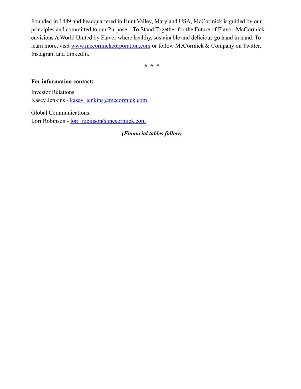 Founded in 1889 and headquartered in Hunt Valley, Maryland USA, McCormick is guided by our principles and committed to our Purpose – To Stand Together for the Future of Flavor. McCormick envisions A World United by Flavor where healthy, sustainable and delicious go hand in hand. To learn more, visit www.mccormickcorporation.com or follow McCormick & Company on Twitter, Instagram and LinkedIn. # # # For information contact: Investor Relations: Kasey Jenkins - kasey_jenkins@mccormick.com Global Communications: Lori Robinson - lori_robinson@mccormick.com (Financial tables follow)