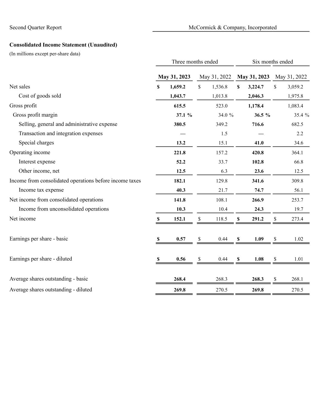 Second Quarter Report McCormick & Company, Incorporated Consolidated Income Statement (Unaudited) (In millions except per-share data) Three months ended Six months ended May 31, 2023 May 31, 2022 May 31, 2023 May 31, 2022 Net sales $ 1,659.2 $ 1,536.8 $ 3,224.7 $ 3,059.2 Cost of goods sold 1,043.7 1,013.8 2,046.3 1,975.8 Gross profit 615.5 523.0 1,178.4 1,083.4 Gross profit margin 37.1 % 34.0 % 36.5 % 35.4 % Selling, general and administrative expense 380.5 349.2 716.6 682.5 Transaction and integration expenses — 1.5 — 2.2 Special charges 13.2 15.1 41.0 34.6 Operating income 221.8 157.2 420.8 364.1 Interest expense 52.2 33.7 102.8 66.8 Other income, net 12.5 6.3 23.6 12.5 Income from consolidated operations before income taxes 182.1 129.8 341.6 309.8 Income tax expense 40.3 21.7 74.7 56.1 Net income from consolidated operations 141.8 108.1 266.9 253.7 Income from unconsolidated operations 10.3 10.4 24.3 19.7 Net income $ 152.1 $ 118.5 $ 291.2 $ 273.4 Earnings per share - basic $ 0.57 $ 0.44 $ 1.09 $ 1.02 Earnings per share - diluted $ 0.56 $ 0.44 $ 1.08 $ 1.01 Average shares outstanding - basic 268.4 268.3 268.3 $ 268.1 Average shares outstanding - diluted 269.8 270.5 269.8 270.5