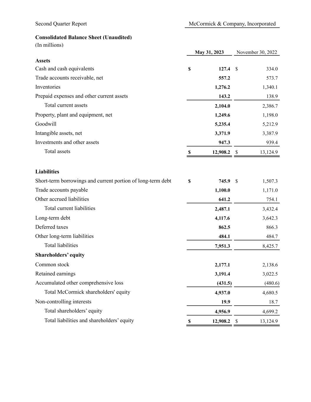Second Quarter Report McCormick & Company, Incorporated Consolidated Balance Sheet (Unaudited) (In millions) May 31, 2023 November 30, 2022 Assets Cash and cash equivalents $ 127.4 $ 334.0 Trade accounts receivable, net 557.2 573.7 Inventories 1,276.2 1,340.1 Prepaid expenses and other current assets 143.2 138.9 Total current assets 2,104.0 2,386.7 Property, plant and equipment, net 1,249.6 1,198.0 Goodwill 5,235.4 5,212.9 Intangible assets, net 3,371.9 3,387.9 Investments and other assets 947.3 939.4 Total assets $ 12,908.2 $ 13,124.9 Liabilities Short-term borrowings and current portion of long-term debt $ 745.9 $ 1,507.3 Trade accounts payable 1,100.0 1,171.0 Other accrued liabilities 641.2 754.1 Total current liabilities 2,487.1 3,432.4 Long-term debt 4,117.6 3,642.3 Deferred taxes 862.5 866.3 Other long-term liabilities 484.1 484.7 Total liabilities 7,951.3 8,425.7 Shareholders’ equity Common stock 2,177.1 2,138.6 Retained earnings 3,191.4 3,022.5 Accumulated other comprehensive loss (431.5) (480.6) Total McCormick shareholders' equity 4,937.0 4,680.5 Non-controlling interests 19.9 18.7 Total shareholders’ equity 4,956.9 4,699.2 Total liabilities and shareholders’ equity $ 12,908.2 $ 13,124.9