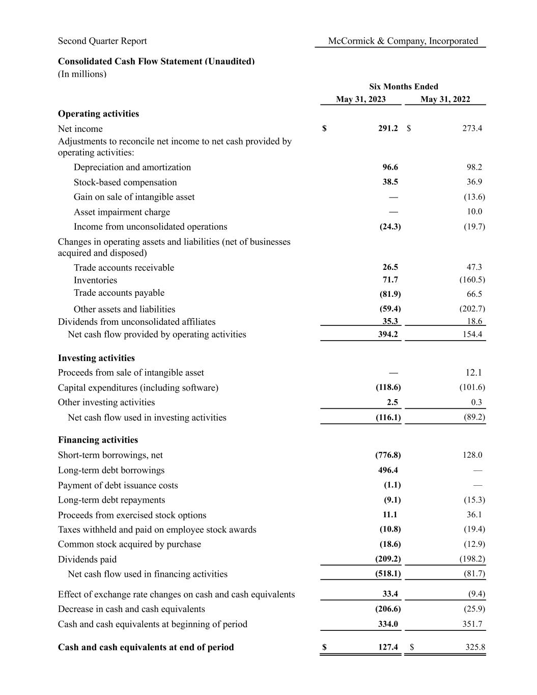 Second Quarter Report McCormick & Company, Incorporated Consolidated Cash Flow Statement (Unaudited) (In millions) Six Months Ended May 31, 2023 May 31, 2022 Operating activities Net income $ 291.2 $ 273.4 Adjustments to reconcile net income to net cash provided by operating activities: Depreciation and amortization 96.6 98.2 Stock-based compensation 38.5 36.9 Gain on sale of intangible asset — (13.6) Asset impairment charge — 10.0 Income from unconsolidated operations (24.3) (19.7) Changes in operating assets and liabilities (net of businesses acquired and disposed) Trade accounts receivable 26.5 47.3 Inventories 71.7 (160.5) Trade accounts payable (81.9) 66.5 Other assets and liabilities (59.4) (202.7) Dividends from unconsolidated affiliates 35.3 18.6 Net cash flow provided by operating activities 394.2 154.4 Investing activities Proceeds from sale of intangible asset — 12.1 Capital expenditures (including software) (118.6) (101.6) Other investing activities 2.5 0.3 Net cash flow used in investing activities (116.1) (89.2) Financing activities Short-term borrowings, net (776.8) 128.0 Long-term debt borrowings 496.4 — Payment of debt issuance costs (1.1) — Long-term debt repayments (9.1) (15.3) Proceeds from exercised stock options 11.1 36.1 Taxes withheld and paid on employee stock awards (10.8) (19.4) Common stock acquired by purchase (18.6) (12.9) Dividends paid (209.2) (198.2) Net cash flow used in financing activities (518.1) (81.7) Effect of exchange rate changes on cash and cash equivalents 33.4 (9.4) Decrease in cash and cash equivalents (206.6) (25.9) Cash and cash equivalents at beginning of period 334.0 351.7 Cash and cash equivalents at end of period $ 127.4 $ 325.8