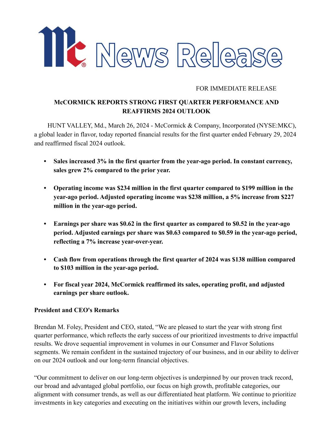 FOR IMMEDIATE RELEASE McCORMICK REPORTS STRONG FIRST QUARTER PERFORMANCE AND REAFFIRMS 2024 OUTLOOK HUNT VALLEY, Md., March 26, 2024 - McCormick & Company, Incorporated (NYSE:MKC), a global leader in flavor, today reported financial results for the first quarter ended February 29, 2024 and reaffirmed fiscal 2024 outlook. • Sales increased 3% in the first quarter from the year-ago period. In constant currency, sales grew 2% compared to the prior year. • Operating income was $234 million in the first quarter compared to $199 million in the year-ago period. Adjusted operating income was $238 million, a 5% increase from $227 million in the year-ago period. • Earnings per share was $0.62 in the first quarter as compared to $0.52 in the year-ago period. Adjusted earnings per share was $0.63 compared to $0.59 in the year-ago period, reflecting a 7% increase year-over-year. • Cash flow from operations through the first quarter of 2024 was $138 million compared to $103 million in the year-ago period. • For fiscal year 2024, McCormick reaffirmed its sales, operating profit, and adjusted earnings per share outlook. President and CEO's Remarks Brendan M. Foley, President and CEO, stated, “We are pleased to start the year with strong first quarter performance, which reflects the early success of our prioritized investments to drive impactful results. We drove sequential improvement in volumes in our Consumer and Flavor Solutions segments. We remain confident in the sustained trajectory of our business, and in our ability to deliver on our 2024 outlook and our long-term financial objectives. “Our commitment to deliver on our long-term objectives is underpinned by our proven track record, our broad and advantaged global portfolio, our focus on high growth, profitable categories, our alignment with consumer trends, as well as our differentiated heat platform. We continue to prioritize investments in key categories and executing on the initiatives within our growth levers, including