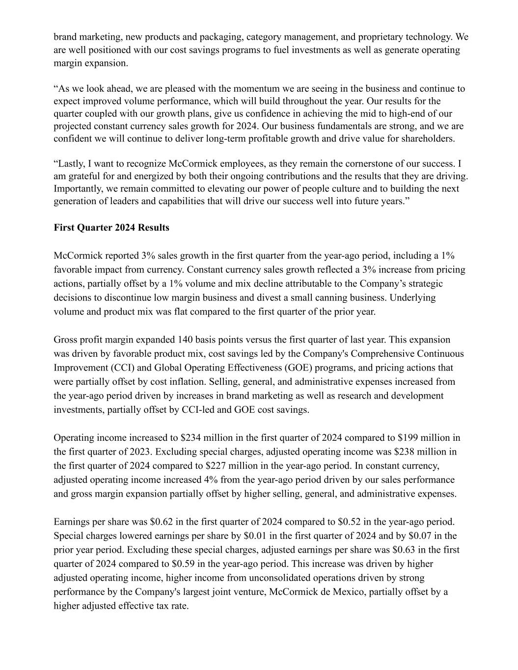 brand marketing, new products and packaging, category management, and proprietary technology. We are well positioned with our cost savings programs to fuel investments as well as generate operating margin expansion. “As we look ahead, we are pleased with the momentum we are seeing in the business and continue to expect improved volume performance, which will build throughout the year. Our results for the quarter coupled with our growth plans, give us confidence in achieving the mid to high-end of our projected constant currency sales growth for 2024. Our business fundamentals are strong, and we are confident we will continue to deliver long-term profitable growth and drive value for shareholders. “Lastly, I want to recognize McCormick employees, as they remain the cornerstone of our success. I am grateful for and energized by both their ongoing contributions and the results that they are driving. Importantly, we remain committed to elevating our power of people culture and to building the next generation of leaders and capabilities that will drive our success well into future years.” First Quarter 2024 Results McCormick reported 3% sales growth in the first quarter from the year-ago period, including a 1% favorable impact from currency. Constant currency sales growth reflected a 3% increase from pricing actions, partially offset by a 1% volume and mix decline attributable to the Company’s strategic decisions to discontinue low margin business and divest a small canning business. Underlying volume and product mix was flat compared to the first quarter of the prior year. Gross profit margin expanded 140 basis points versus the first quarter of last year. This expansion was driven by favorable product mix, cost savings led by the Company's Comprehensive Continuous Improvement (CCI) and Global Operating Effectiveness (GOE) programs, and pricing actions that were partially offset by cost inflation. Selling, general, and administrative expenses increased from the year-ago period driven by increases in brand marketing as well as research and development investments, partially offset by CCI-led and GOE cost savings. Operating income increased to $234 million in the first quarter of 2024 compared to $199 million in the first quarter of 2023. Excluding special charges, adjusted operating income was $238 million in the first quarter of 2024 compared to $227 million in the year-ago period. In constant currency, adjusted operating income increased 4% from the year-ago period driven by our sales performance and gross margin expansion partially offset by higher selling, general, and administrative expenses. Earnings per share was $0.62 in the first quarter of 2024 compared to $0.52 in the year-ago period. Special charges lowered earnings per share by $0.01 in the first quarter of 2024 and by $0.07 in the prior year period. Excluding these special charges, adjusted earnings per share was $0.63 in the first quarter of 2024 compared to $0.59 in the year-ago period. This increase was driven by higher adjusted operating income, higher income from unconsolidated operations driven by strong performance by the Company's largest joint venture, McCormick de Mexico, partially offset by a higher adjusted effective tax rate.