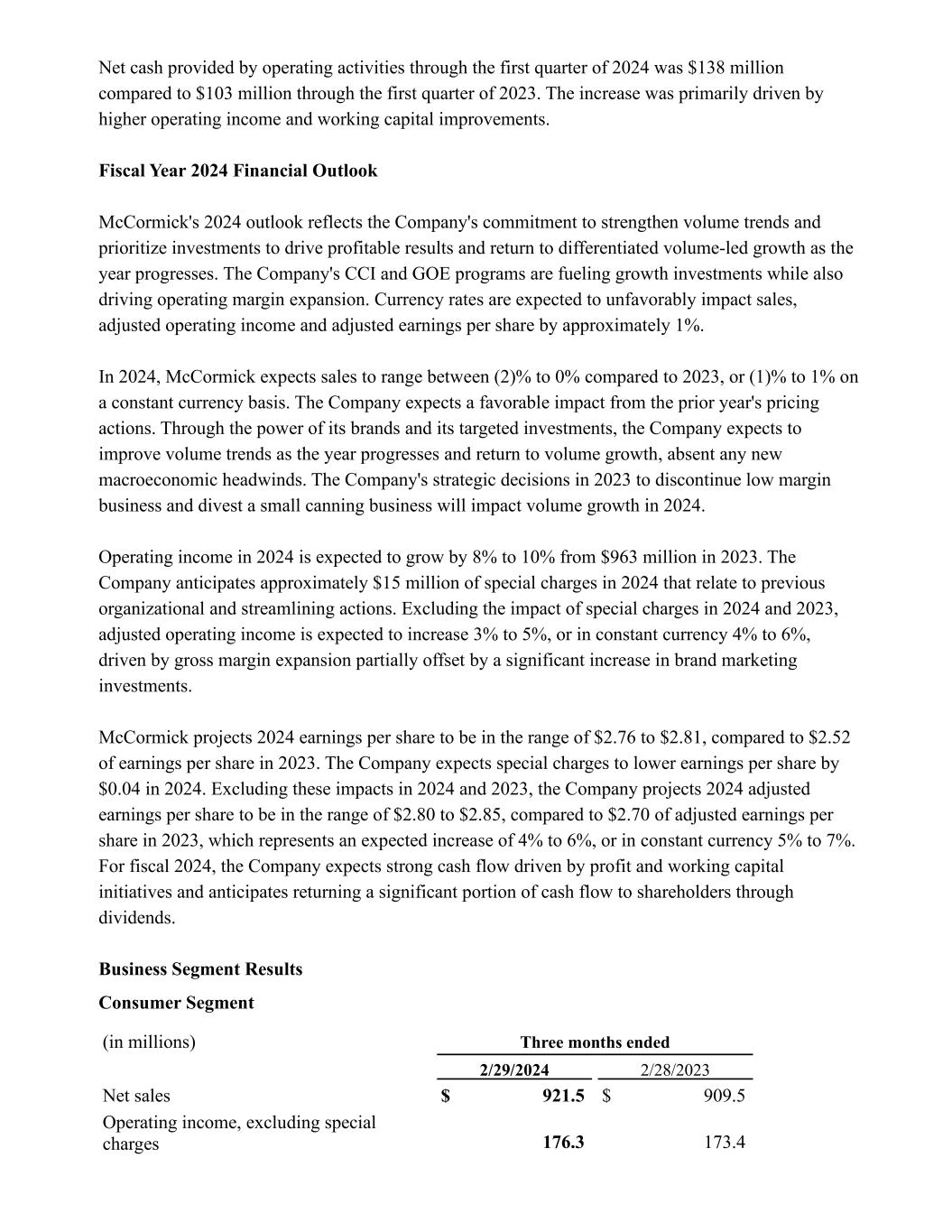 Net cash provided by operating activities through the first quarter of 2024 was $138 million compared to $103 million through the first quarter of 2023. The increase was primarily driven by higher operating income and working capital improvements. Fiscal Year 2024 Financial Outlook McCormick's 2024 outlook reflects the Company's commitment to strengthen volume trends and prioritize investments to drive profitable results and return to differentiated volume-led growth as the year progresses. The Company's CCI and GOE programs are fueling growth investments while also driving operating margin expansion. Currency rates are expected to unfavorably impact sales, adjusted operating income and adjusted earnings per share by approximately 1%. In 2024, McCormick expects sales to range between (2)% to 0% compared to 2023, or (1)% to 1% on a constant currency basis. The Company expects a favorable impact from the prior year's pricing actions. Through the power of its brands and its targeted investments, the Company expects to improve volume trends as the year progresses and return to volume growth, absent any new macroeconomic headwinds. The Company's strategic decisions in 2023 to discontinue low margin business and divest a small canning business will impact volume growth in 2024. Operating income in 2024 is expected to grow by 8% to 10% from $963 million in 2023. The Company anticipates approximately $15 million of special charges in 2024 that relate to previous organizational and streamlining actions. Excluding the impact of special charges in 2024 and 2023, adjusted operating income is expected to increase 3% to 5%, or in constant currency 4% to 6%, driven by gross margin expansion partially offset by a significant increase in brand marketing investments. McCormick projects 2024 earnings per share to be in the range of $2.76 to $2.81, compared to $2.52 of earnings per share in 2023. The Company expects special charges to lower earnings per share by $0.04 in 2024. Excluding these impacts in 2024 and 2023, the Company projects 2024 adjusted earnings per share to be in the range of $2.80 to $2.85, compared to $2.70 of adjusted earnings per share in 2023, which represents an expected increase of 4% to 6%, or in constant currency 5% to 7%. For fiscal 2024, the Company expects strong cash flow driven by profit and working capital initiatives and anticipates returning a significant portion of cash flow to shareholders through dividends. Business Segment Results Consumer Segment (in millions) Three months ended 2/29/2024 2/28/2023 Net sales $ 921.5 $ 909.5 Operating income, excluding special charges 176.3 173.4