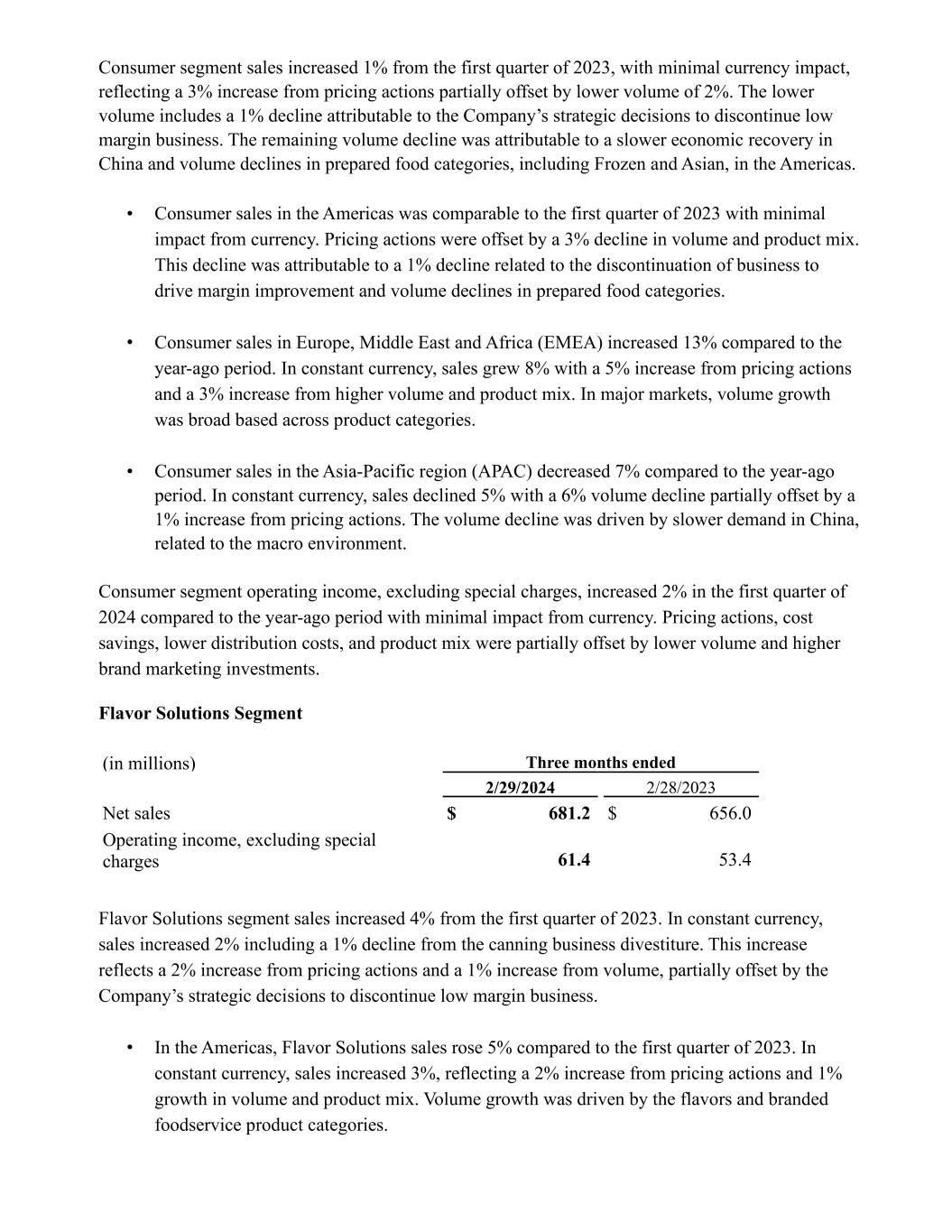 Consumer segment sales increased 1% from the first quarter of 2023, with minimal currency impact, reflecting a 3% increase from pricing actions partially offset by lower volume of 2%. The lower volume includes a 1% decline attributable to the Company’s strategic decisions to discontinue low margin business. The remaining volume decline was attributable to a slower economic recovery in China and volume declines in prepared food categories, including Frozen and Asian, in the Americas. • Consumer sales in the Americas was comparable to the first quarter of 2023 with minimal impact from currency. Pricing actions were offset by a 3% decline in volume and product mix. This decline was attributable to a 1% decline related to the discontinuation of business to drive margin improvement and volume declines in prepared food categories. • Consumer sales in Europe, Middle East and Africa (EMEA) increased 13% compared to the year-ago period. In constant currency, sales grew 8% with a 5% increase from pricing actions and a 3% increase from higher volume and product mix. In major markets, volume growth was broad based across product categories. • Consumer sales in the Asia-Pacific region (APAC) decreased 7% compared to the year-ago period. In constant currency, sales declined 5% with a 6% volume decline partially offset by a 1% increase from pricing actions. The volume decline was driven by slower demand in China, related to the macro environment. Consumer segment operating income, excluding special charges, increased 2% in the first quarter of 2024 compared to the year-ago period with minimal impact from currency. Pricing actions, cost savings, lower distribution costs, and product mix were partially offset by lower volume and higher brand marketing investments. Flavor Solutions Segment (in millions) Three months ended 2/29/2024 2/28/2023 Net sales $ 681.2 $ 656.0 Operating income, excluding special charges 61.4 53.4 Flavor Solutions segment sales increased 4% from the first quarter of 2023. In constant currency, sales increased 2% including a 1% decline from the canning business divestiture. This increase reflects a 2% increase from pricing actions and a 1% increase from volume, partially offset by the Company’s strategic decisions to discontinue low margin business. • In the Americas, Flavor Solutions sales rose 5% compared to the first quarter of 2023. In constant currency, sales increased 3%, reflecting a 2% increase from pricing actions and 1% growth in volume and product mix. Volume growth was driven by the flavors and branded foodservice product categories.