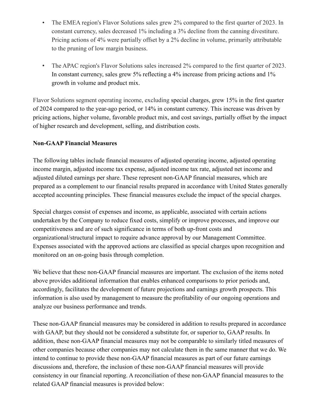 • The EMEA region's Flavor Solutions sales grew 2% compared to the first quarter of 2023. In constant currency, sales decreased 1% including a 3% decline from the canning divestiture. Pricing actions of 4% were partially offset by a 2% decline in volume, primarily attributable to the pruning of low margin business. • The APAC region's Flavor Solutions sales increased 2% compared to the first quarter of 2023. In constant currency, sales grew 5% reflecting a 4% increase from pricing actions and 1% growth in volume and product mix. Flavor Solutions segment operating income, excluding special charges, grew 15% in the first quarter of 2024 compared to the year-ago period, or 14% in constant currency. This increase was driven by pricing actions, higher volume, favorable product mix, and cost savings, partially offset by the impact of higher research and development, selling, and distribution costs. Non-GAAP Financial Measures The following tables include financial measures of adjusted operating income, adjusted operating income margin, adjusted income tax expense, adjusted income tax rate, adjusted net income and adjusted diluted earnings per share. These represent non-GAAP financial measures, which are prepared as a complement to our financial results prepared in accordance with United States generally accepted accounting principles. These financial measures exclude the impact of the special charges. Special charges consist of expenses and income, as applicable, associated with certain actions undertaken by the Company to reduce fixed costs, simplify or improve processes, and improve our competitiveness and are of such significance in terms of both up-front costs and organizational/structural impact to require advance approval by our Management Committee. Expenses associated with the approved actions are classified as special charges upon recognition and monitored on an on-going basis through completion. We believe that these non-GAAP financial measures are important. The exclusion of the items noted above provides additional information that enables enhanced comparisons to prior periods and, accordingly, facilitates the development of future projections and earnings growth prospects. This information is also used by management to measure the profitability of our ongoing operations and analyze our business performance and trends. These non-GAAP financial measures may be considered in addition to results prepared in accordance with GAAP, but they should not be considered a substitute for, or superior to, GAAP results. In addition, these non-GAAP financial measures may not be comparable to similarly titled measures of other companies because other companies may not calculate them in the same manner that we do. We intend to continue to provide these non-GAAP financial measures as part of our future earnings discussions and, therefore, the inclusion of these non-GAAP financial measures will provide consistency in our financial reporting. A reconciliation of these non-GAAP financial measures to the related GAAP financial measures is provided below: