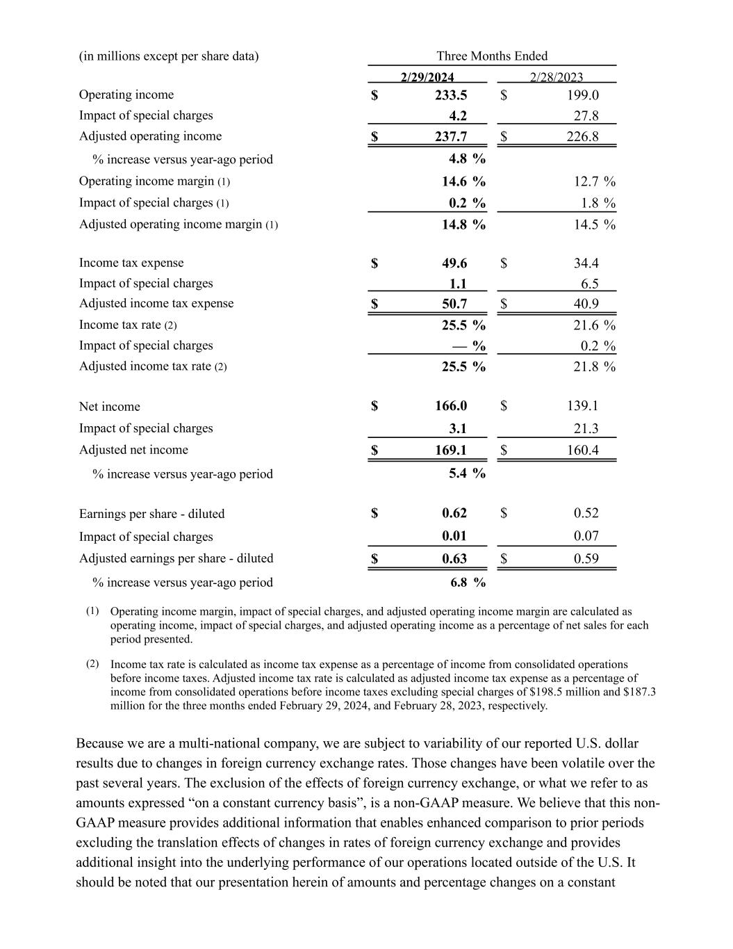 (in millions except per share data) Three Months Ended 2/29/2024 2/28/2023 Operating income $ 233.5 $ 199.0 Impact of special charges 4.2 27.8 Adjusted operating income $ 237.7 $ 226.8 % increase versus year-ago period 4.8 % Operating income margin (1) 14.6 % 12.7 % Impact of special charges (1) 0.2 % 1.8 % Adjusted operating income margin (1) 14.8 % 14.5 % Income tax expense $ 49.6 $ 34.4 Impact of special charges 1.1 6.5 Adjusted income tax expense $ 50.7 $ 40.9 Income tax rate (2) 25.5 % 21.6 % Impact of special charges — % 0.2 % Adjusted income tax rate (2) 25.5 % 21.8 % Net income $ 166.0 $ 139.1 Impact of special charges 3.1 21.3 Adjusted net income $ 169.1 $ 160.4 % increase versus year-ago period 5.4 % Earnings per share - diluted $ 0.62 $ 0.52 Impact of special charges 0.01 0.07 Adjusted earnings per share - diluted $ 0.63 $ 0.59 % increase versus year-ago period 6.8 % (1) Operating income margin, impact of special charges, and adjusted operating income margin are calculated as operating income, impact of special charges, and adjusted operating income as a percentage of net sales for each period presented. (2) Income tax rate is calculated as income tax expense as a percentage of income from consolidated operations before income taxes. Adjusted income tax rate is calculated as adjusted income tax expense as a percentage of income from consolidated operations before income taxes excluding special charges of $198.5 million and $187.3 million for the three months ended February 29, 2024, and February 28, 2023, respectively. Because we are a multi-national company, we are subject to variability of our reported U.S. dollar results due to changes in foreign currency exchange rates. Those changes have been volatile over the past several years. The exclusion of the effects of foreign currency exchange, or what we refer to as amounts expressed “on a constant currency basis”, is a non-GAAP measure. We believe that this non- GAAP measure provides additional information that enables enhanced comparison to prior periods excluding the translation effects of changes in rates of foreign currency exchange and provides additional insight into the underlying performance of our operations located outside of the U.S. It should be noted that our presentation herein of amounts and percentage changes on a constant