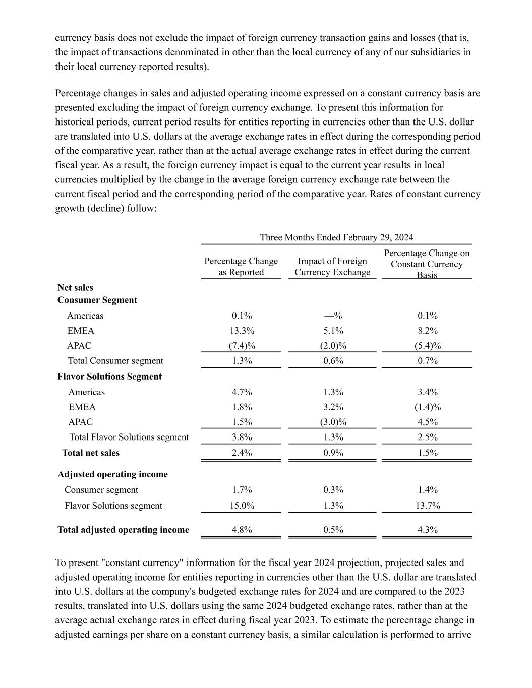 currency basis does not exclude the impact of foreign currency transaction gains and losses (that is, the impact of transactions denominated in other than the local currency of any of our subsidiaries in their local currency reported results). Percentage changes in sales and adjusted operating income expressed on a constant currency basis are presented excluding the impact of foreign currency exchange. To present this information for historical periods, current period results for entities reporting in currencies other than the U.S. dollar are translated into U.S. dollars at the average exchange rates in effect during the corresponding period of the comparative year, rather than at the actual average exchange rates in effect during the current fiscal year. As a result, the foreign currency impact is equal to the current year results in local currencies multiplied by the change in the average foreign currency exchange rate between the current fiscal period and the corresponding period of the comparative year. Rates of constant currency growth (decline) follow: Three Months Ended February 29, 2024 Percentage Change as Reported Impact of Foreign Currency Exchange Percentage Change on Constant Currency Basis Net sales Consumer Segment Americas 0.1% —% 0.1% EMEA 13.3% 5.1% 8.2% APAC (7.4)% (2.0)% (5.4)% Total Consumer segment 1.3% 0.6% 0.7% Flavor Solutions Segment Americas 4.7% 1.3% 3.4% EMEA 1.8% 3.2% (1.4)% APAC 1.5% (3.0)% 4.5% Total Flavor Solutions segment 3.8% 1.3% 2.5% Total net sales 2.4% 0.9% 1.5% Adjusted operating income Consumer segment 1.7% 0.3% 1.4% Flavor Solutions segment 15.0% 1.3% 13.7% Total adjusted operating income 4.8% 0.5% 4.3% To present "constant currency" information for the fiscal year 2024 projection, projected sales and adjusted operating income for entities reporting in currencies other than the U.S. dollar are translated into U.S. dollars at the company's budgeted exchange rates for 2024 and are compared to the 2023 results, translated into U.S. dollars using the same 2024 budgeted exchange rates, rather than at the average actual exchange rates in effect during fiscal year 2023. To estimate the percentage change in adjusted earnings per share on a constant currency basis, a similar calculation is performed to arrive
