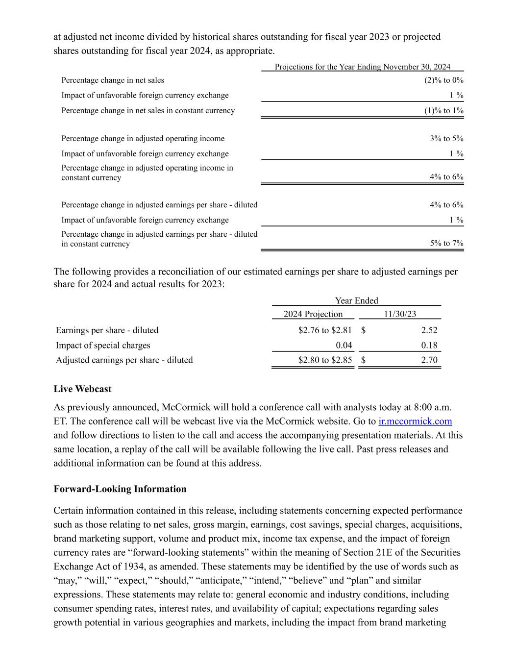 at adjusted net income divided by historical shares outstanding for fiscal year 2023 or projected shares outstanding for fiscal year 2024, as appropriate. Projections for the Year Ending November 30, 2024 Percentage change in net sales (2)% to 0% Impact of unfavorable foreign currency exchange 1 % Percentage change in net sales in constant currency (1)% to 1% Percentage change in adjusted operating income 3% to 5% Impact of unfavorable foreign currency exchange 1 % Percentage change in adjusted operating income in constant currency 4% to 6% Percentage change in adjusted earnings per share - diluted 4% to 6% Impact of unfavorable foreign currency exchange 1 % Percentage change in adjusted earnings per share - diluted in constant currency 5% to 7% The following provides a reconciliation of our estimated earnings per share to adjusted earnings per share for 2024 and actual results for 2023: Year Ended 2024 Projection 11/30/23 Earnings per share - diluted $2.76 to $2.81 $ 2.52 Impact of special charges 0.04 0.18 Adjusted earnings per share - diluted $2.80 to $2.85 $ 2.70 Live Webcast As previously announced, McCormick will hold a conference call with analysts today at 8:00 a.m. ET. The conference call will be webcast live via the McCormick website. Go to ir.mccormick.com and follow directions to listen to the call and access the accompanying presentation materials. At this same location, a replay of the call will be available following the live call. Past press releases and additional information can be found at this address. Forward-Looking Information Certain information contained in this release, including statements concerning expected performance such as those relating to net sales, gross margin, earnings, cost savings, special charges, acquisitions, brand marketing support, volume and product mix, income tax expense, and the impact of foreign currency rates are “forward-looking statements” within the meaning of Section 21E of the Securities Exchange Act of 1934, as amended. These statements may be identified by the use of words such as “may,” “will,” “expect,” “should,” “anticipate,” “intend,” “believe” and “plan” and similar expressions. These statements may relate to: general economic and industry conditions, including consumer spending rates, interest rates, and availability of capital; expectations regarding sales growth potential in various geographies and markets, including the impact from brand marketing