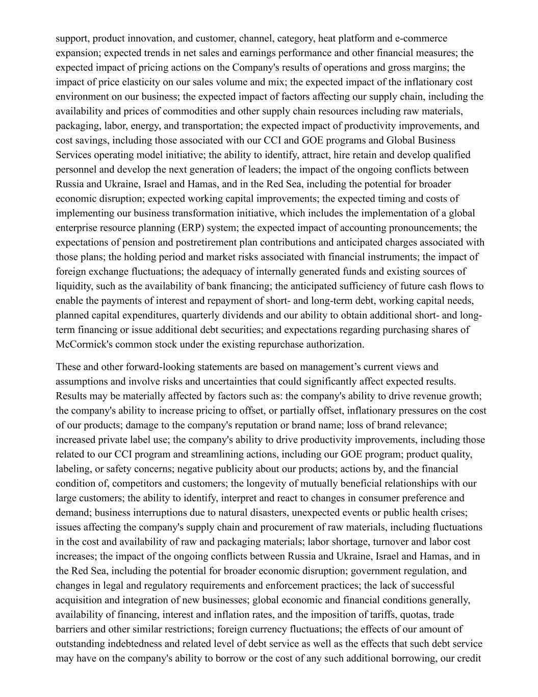 support, product innovation, and customer, channel, category, heat platform and e-commerce expansion; expected trends in net sales and earnings performance and other financial measures; the expected impact of pricing actions on the Company's results of operations and gross margins; the impact of price elasticity on our sales volume and mix; the expected impact of the inflationary cost environment on our business; the expected impact of factors affecting our supply chain, including the availability and prices of commodities and other supply chain resources including raw materials, packaging, labor, energy, and transportation; the expected impact of productivity improvements, and cost savings, including those associated with our CCI and GOE programs and Global Business Services operating model initiative; the ability to identify, attract, hire retain and develop qualified personnel and develop the next generation of leaders; the impact of the ongoing conflicts between Russia and Ukraine, Israel and Hamas, and in the Red Sea, including the potential for broader economic disruption; expected working capital improvements; the expected timing and costs of implementing our business transformation initiative, which includes the implementation of a global enterprise resource planning (ERP) system; the expected impact of accounting pronouncements; the expectations of pension and postretirement plan contributions and anticipated charges associated with those plans; the holding period and market risks associated with financial instruments; the impact of foreign exchange fluctuations; the adequacy of internally generated funds and existing sources of liquidity, such as the availability of bank financing; the anticipated sufficiency of future cash flows to enable the payments of interest and repayment of short- and long-term debt, working capital needs, planned capital expenditures, quarterly dividends and our ability to obtain additional short- and long- term financing or issue additional debt securities; and expectations regarding purchasing shares of McCormick's common stock under the existing repurchase authorization. These and other forward-looking statements are based on management’s current views and assumptions and involve risks and uncertainties that could significantly affect expected results. Results may be materially affected by factors such as: the company's ability to drive revenue growth; the company's ability to increase pricing to offset, or partially offset, inflationary pressures on the cost of our products; damage to the company's reputation or brand name; loss of brand relevance; increased private label use; the company's ability to drive productivity improvements, including those related to our CCI program and streamlining actions, including our GOE program; product quality, labeling, or safety concerns; negative publicity about our products; actions by, and the financial condition of, competitors and customers; the longevity of mutually beneficial relationships with our large customers; the ability to identify, interpret and react to changes in consumer preference and demand; business interruptions due to natural disasters, unexpected events or public health crises; issues affecting the company's supply chain and procurement of raw materials, including fluctuations in the cost and availability of raw and packaging materials; labor shortage, turnover and labor cost increases; the impact of the ongoing conflicts between Russia and Ukraine, Israel and Hamas, and in the Red Sea, including the potential for broader economic disruption; government regulation, and changes in legal and regulatory requirements and enforcement practices; the lack of successful acquisition and integration of new businesses; global economic and financial conditions generally, availability of financing, interest and inflation rates, and the imposition of tariffs, quotas, trade barriers and other similar restrictions; foreign currency fluctuations; the effects of our amount of outstanding indebtedness and related level of debt service as well as the effects that such debt service may have on the company's ability to borrow or the cost of any such additional borrowing, our credit