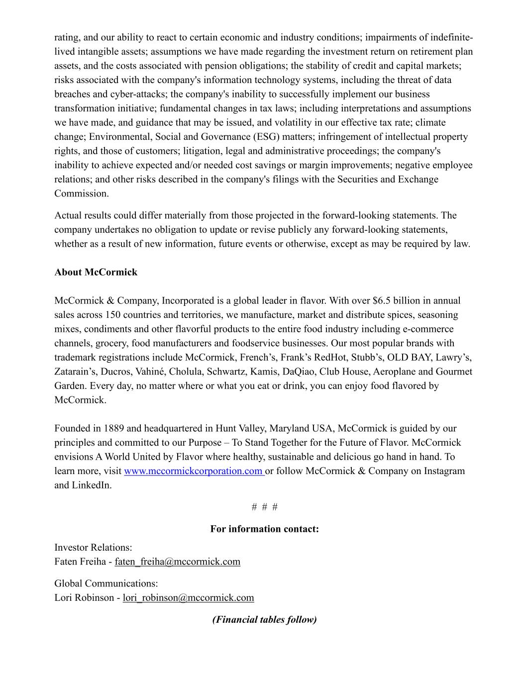 rating, and our ability to react to certain economic and industry conditions; impairments of indefinite- lived intangible assets; assumptions we have made regarding the investment return on retirement plan assets, and the costs associated with pension obligations; the stability of credit and capital markets; risks associated with the company's information technology systems, including the threat of data breaches and cyber-attacks; the company's inability to successfully implement our business transformation initiative; fundamental changes in tax laws; including interpretations and assumptions we have made, and guidance that may be issued, and volatility in our effective tax rate; climate change; Environmental, Social and Governance (ESG) matters; infringement of intellectual property rights, and those of customers; litigation, legal and administrative proceedings; the company's inability to achieve expected and/or needed cost savings or margin improvements; negative employee relations; and other risks described in the company's filings with the Securities and Exchange Commission. Actual results could differ materially from those projected in the forward-looking statements. The company undertakes no obligation to update or revise publicly any forward-looking statements, whether as a result of new information, future events or otherwise, except as may be required by law. About McCormick McCormick & Company, Incorporated is a global leader in flavor. With over $6.5 billion in annual sales across 150 countries and territories, we manufacture, market and distribute spices, seasoning mixes, condiments and other flavorful products to the entire food industry including e-commerce channels, grocery, food manufacturers and foodservice businesses. Our most popular brands with trademark registrations include McCormick, French’s, Frank’s RedHot, Stubb’s, OLD BAY, Lawry’s, Zatarain’s, Ducros, Vahiné, Cholula, Schwartz, Kamis, DaQiao, Club House, Aeroplane and Gourmet Garden. Every day, no matter where or what you eat or drink, you can enjoy food flavored by McCormick. Founded in 1889 and headquartered in Hunt Valley, Maryland USA, McCormick is guided by our principles and committed to our Purpose – To Stand Together for the Future of Flavor. McCormick envisions A World United by Flavor where healthy, sustainable and delicious go hand in hand. To learn more, visit www.mccormickcorporation.com or follow McCormick & Company on Instagram and LinkedIn. # # # For information contact: Investor Relations: Faten Freiha - faten_freiha@mccormick.com Global Communications: Lori Robinson - lori_robinson@mccormick.com (Financial tables follow)