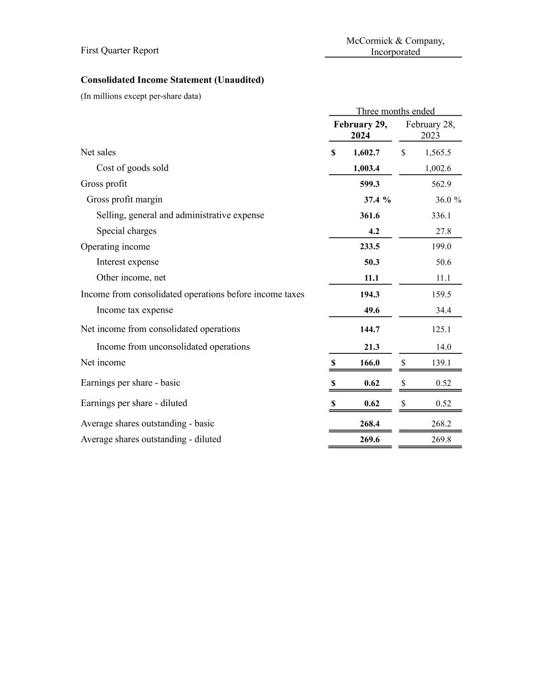 First Quarter Report McCormick & Company, Incorporated Consolidated Income Statement (Unaudited) (In millions except per-share data) Three months ended February 29, 2024 February 28, 2023 Net sales $ 1,602.7 $ 1,565.5 Cost of goods sold 1,003.4 1,002.6 Gross profit 599.3 562.9 Gross profit margin 37.4 % 36.0 % Selling, general and administrative expense 361.6 336.1 Special charges 4.2 27.8 Operating income 233.5 199.0 Interest expense 50.3 50.6 Other income, net 11.1 11.1 Income from consolidated operations before income taxes 194.3 159.5 Income tax expense 49.6 34.4 Net income from consolidated operations 144.7 125.1 Income from unconsolidated operations 21.3 14.0 Net income $ 166.0 $ 139.1 Earnings per share - basic $ 0.62 $ 0.52 Earnings per share - diluted $ 0.62 $ 0.52 Average shares outstanding - basic 268.4 268.2 Average shares outstanding - diluted 269.6 269.8