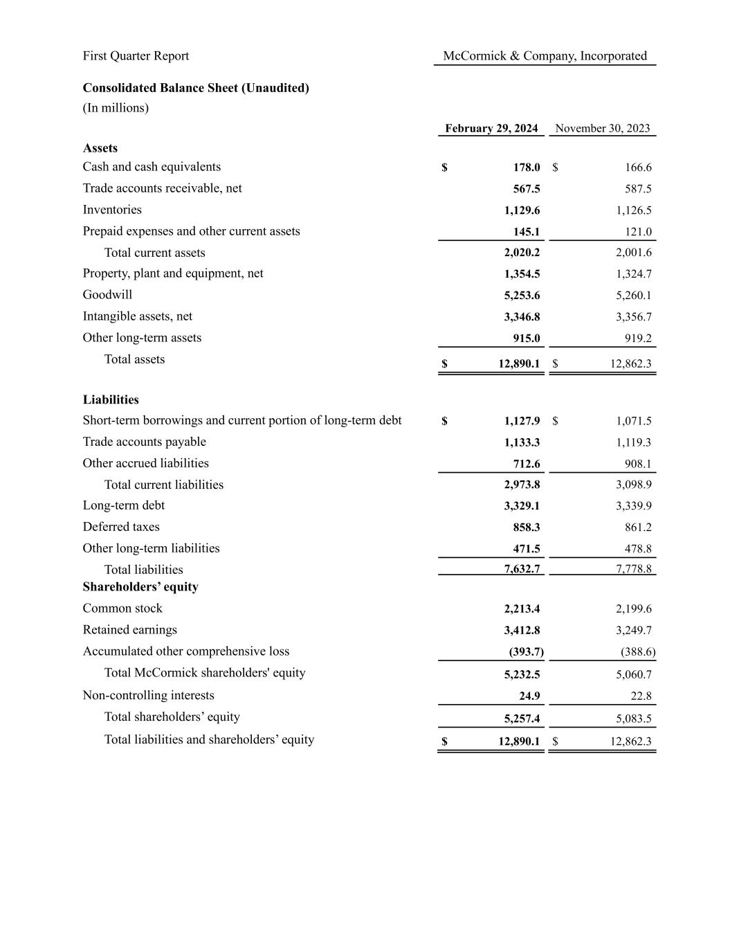 First Quarter Report McCormick & Company, Incorporated Consolidated Balance Sheet (Unaudited) (In millions) February 29, 2024 November 30, 2023 Assets Cash and cash equivalents $ 178.0 $ 166.6 Trade accounts receivable, net 567.5 587.5 Inventories 1,129.6 1,126.5 Prepaid expenses and other current assets 145.1 121.0 Total current assets 2,020.2 2,001.6 Property, plant and equipment, net 1,354.5 1,324.7 Goodwill 5,253.6 5,260.1 Intangible assets, net 3,346.8 3,356.7 Other long-term assets 915.0 919.2 Total assets $ 12,890.1 $ 12,862.3 Liabilities Short-term borrowings and current portion of long-term debt $ 1,127.9 $ 1,071.5 Trade accounts payable 1,133.3 1,119.3 Other accrued liabilities 712.6 908.1 Total current liabilities 2,973.8 3,098.9 Long-term debt 3,329.1 3,339.9 Deferred taxes 858.3 861.2 Other long-term liabilities 471.5 478.8 Total liabilities 7,632.7 7,778.8 Shareholders’ equity Common stock 2,213.4 2,199.6 Retained earnings 3,412.8 3,249.7 Accumulated other comprehensive loss (393.7) (388.6) Total McCormick shareholders' equity 5,232.5 5,060.7 Non-controlling interests 24.9 22.8 Total shareholders’ equity 5,257.4 5,083.5 Total liabilities and shareholders’ equity $ 12,890.1 $ 12,862.3