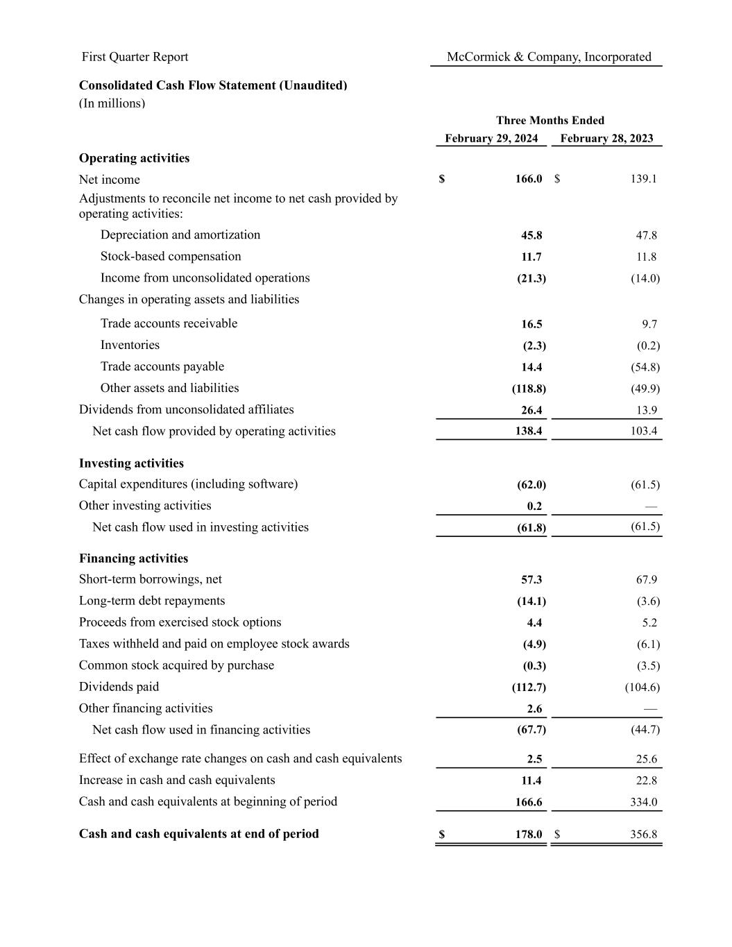 First Quarter Report McCormick & Company, Incorporated Consolidated Cash Flow Statement (Unaudited) (In millions) Three Months Ended February 29, 2024 February 28, 2023 Operating activities Net income $ 166.0 $ 139.1 Adjustments to reconcile net income to net cash provided by operating activities: Depreciation and amortization 45.8 47.8 Stock-based compensation 11.7 11.8 Income from unconsolidated operations (21.3) (14.0) Changes in operating assets and liabilities Trade accounts receivable 16.5 9.7 Inventories (2.3) (0.2) Trade accounts payable 14.4 (54.8) Other assets and liabilities (118.8) (49.9) Dividends from unconsolidated affiliates 26.4 13.9 Net cash flow provided by operating activities 138.4 103.4 Investing activities Capital expenditures (including software) (62.0) (61.5) Other investing activities 0.2 — Net cash flow used in investing activities (61.8) (61.5) Financing activities Short-term borrowings, net 57.3 67.9 Long-term debt repayments (14.1) (3.6) Proceeds from exercised stock options 4.4 5.2 Taxes withheld and paid on employee stock awards (4.9) (6.1) Common stock acquired by purchase (0.3) (3.5) Dividends paid (112.7) (104.6) Other financing activities 2.6 — Net cash flow used in financing activities (67.7) (44.7) Effect of exchange rate changes on cash and cash equivalents 2.5 25.6 Increase in cash and cash equivalents 11.4 22.8 Cash and cash equivalents at beginning of period 166.6 334.0 Cash and cash equivalents at end of period $ 178.0 $ 356.8
