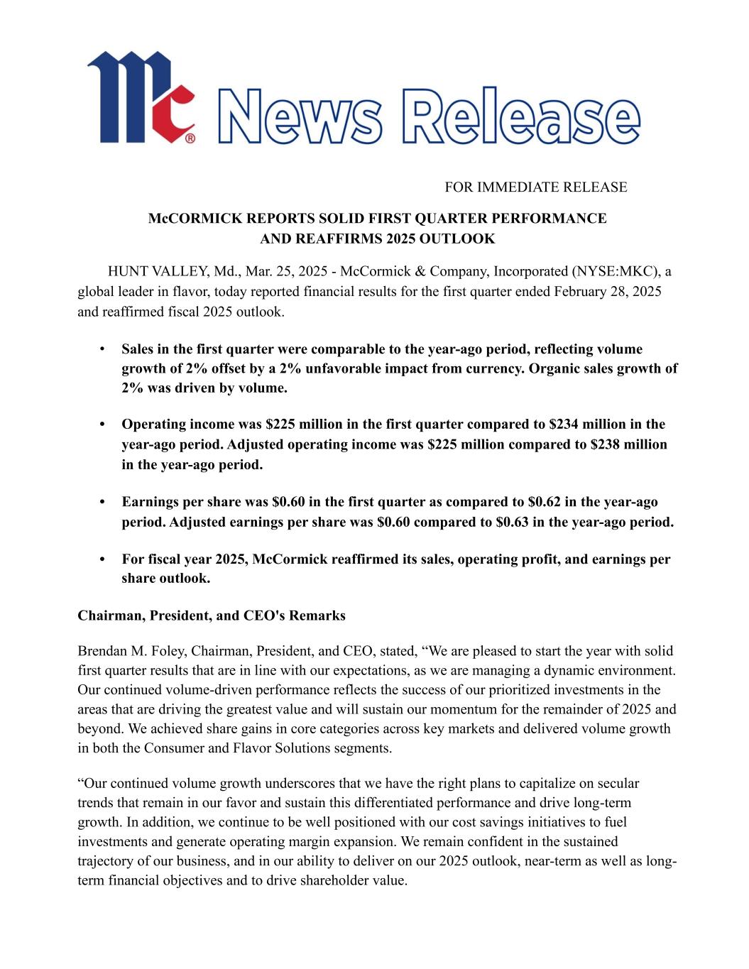 FOR IMMEDIATE RELEASE McCORMICK REPORTS SOLID FIRST QUARTER PERFORMANCE AND REAFFIRMS 2025 OUTLOOK HUNT VALLEY, Md., Mar. 25, 2025 - McCormick & Company, Incorporated (NYSE:MKC), a global leader in flavor, today reported financial results for the first quarter ended February 28, 2025 and reaffirmed fiscal 2025 outlook. • Sales in the first quarter were comparable to the year-ago period, reflecting volume growth of 2% offset by a 2% unfavorable impact from currency. Organic sales growth of 2% was driven by volume. • Operating income was $225 million in the first quarter compared to $234 million in the year-ago period. Adjusted operating income was $225 million compared to $238 million in the year-ago period. • Earnings per share was $0.60 in the first quarter as compared to $0.62 in the year-ago period. Adjusted earnings per share was $0.60 compared to $0.63 in the year-ago period. • For fiscal year 2025, McCormick reaffirmed its sales, operating profit, and earnings per share outlook. Chairman, President, and CEO's Remarks Brendan M. Foley, Chairman, President, and CEO, stated, “We are pleased to start the year with solid first quarter results that are in line with our expectations, as we are managing a dynamic environment. Our continued volume-driven performance reflects the success of our prioritized investments in the areas that are driving the greatest value and will sustain our momentum for the remainder of 2025 and beyond. We achieved share gains in core categories across key markets and delivered volume growth in both the Consumer and Flavor Solutions segments. “Our continued volume growth underscores that we have the right plans to capitalize on secular trends that remain in our favor and sustain this differentiated performance and drive long-term growth. In addition, we continue to be well positioned with our cost savings initiatives to fuel investments and generate operating margin expansion. We remain confident in the sustained trajectory of our business, and in our ability to deliver on our 2025 outlook, near-term as well as long- term financial objectives and to drive shareholder value.