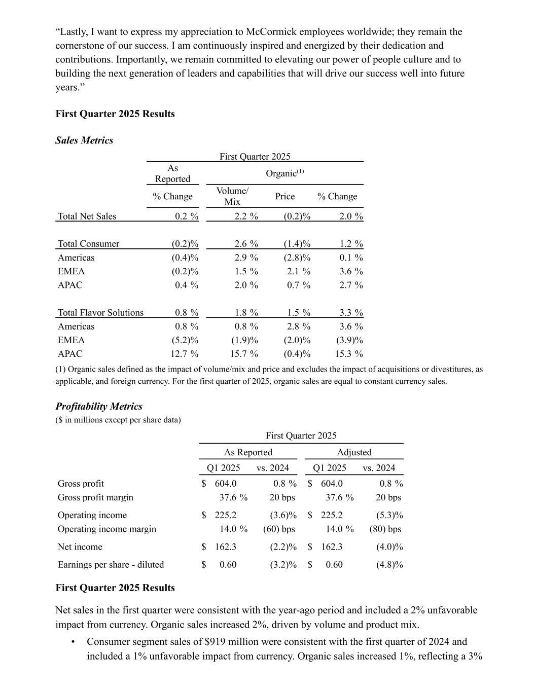 “Lastly, I want to express my appreciation to McCormick employees worldwide; they remain the cornerstone of our success. I am continuously inspired and energized by their dedication and contributions. Importantly, we remain committed to elevating our power of people culture and to building the next generation of leaders and capabilities that will drive our success well into future years.” First Quarter 2025 Results Sales Metrics First Quarter 2025 As Reported Organic(1) % Change Volume/ Mix Price % Change Total Net Sales 0.2 % 2.2 % (0.2) % 2.0 % Total Consumer (0.2) % 2.6 % (1.4) % 1.2 % Americas (0.4) % 2.9 % (2.8) % 0.1 % EMEA (0.2) % 1.5 % 2.1 % 3.6 % APAC 0.4 % 2.0 % 0.7 % 2.7 % Total Flavor Solutions 0.8 % 1.8 % 1.5 % 3.3 % Americas 0.8 % 0.8 % 2.8 % 3.6 % EMEA (5.2) % (1.9) % (2.0) % (3.9) % APAC 12.7 % 15.7 % (0.4) % 15.3 % (1) Organic sales defined as the impact of volume/mix and price and excludes the impact of acquisitions or divestitures, as applicable, and foreign currency. For the first quarter of 2025, organic sales are equal to constant currency sales. Profitability Metrics ($ in millions except per share data) First Quarter 2025 As Reported Adjusted Q1 2025 vs. 2024 Q1 2025 vs. 2024 Gross profit $ 604.0 0.8 % $ 604.0 0.8 % Gross profit margin 37.6 % 20 bps 37.6 % 20 bps Operating income $ 225.2 (3.6) % $ 225.2 (5.3) % Operating income margin 14.0 % (60) bps 14.0 % (80) bps Net income $ 162.3 (2.2) % $ 162.3 (4.0) % Earnings per share - diluted $ 0.60 (3.2) % $ 0.60 (4.8) % First Quarter 2025 Results Net sales in the first quarter were consistent with the year-ago period and included a 2% unfavorable impact from currency. Organic sales increased 2%, driven by volume and product mix. • Consumer segment sales of $919 million were consistent with the first quarter of 2024 and included a 1% unfavorable impact from currency. Organic sales increased 1%, reflecting a 3%