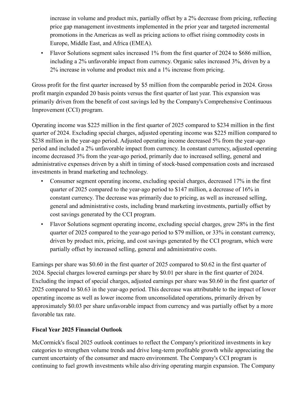 increase in volume and product mix, partially offset by a 2% decrease from pricing, reflecting price gap management investments implemented in the prior year and targeted incremental promotions in the Americas as well as pricing actions to offset rising commodity costs in Europe, Middle East, and Africa (EMEA). • Flavor Solutions segment sales increased 1% from the first quarter of 2024 to $686 million, including a 2% unfavorable impact from currency. Organic sales increased 3%, driven by a 2% increase in volume and product mix and a 1% increase from pricing. Gross profit for the first quarter increased by $5 million from the comparable period in 2024. Gross profit margin expanded 20 basis points versus the first quarter of last year. This expansion was primarily driven from the benefit of cost savings led by the Company's Comprehensive Continuous Improvement (CCI) program. Operating income was $225 million in the first quarter of 2025 compared to $234 million in the first quarter of 2024. Excluding special charges, adjusted operating income was $225 million compared to $238 million in the year-ago period. Adjusted operating income decreased 5% from the year-ago period and included a 2% unfavorable impact from currency. In constant currency, adjusted operating income decreased 3% from the year-ago period, primarily due to increased selling, general and administrative expenses driven by a shift in timing of stock-based compensation costs and increased investments in brand marketing and technology. • Consumer segment operating income, excluding special charges, decreased 17% in the first quarter of 2025 compared to the year-ago period to $147 million, a decrease of 16% in constant currency. The decrease was primarily due to pricing, as well as increased selling, general and administrative costs, including brand marketing investments, partially offset by cost savings generated by the CCI program. • Flavor Solutions segment operating income, excluding special charges, grew 28% in the first quarter of 2025 compared to the year-ago period to $79 million, or 33% in constant currency, driven by product mix, pricing, and cost savings generated by the CCI program, which were partially offset by increased selling, general and administrative costs. Earnings per share was $0.60 in the first quarter of 2025 compared to $0.62 in the first quarter of 2024. Special charges lowered earnings per share by $0.01 per share in the first quarter of 2024. Excluding the impact of special charges, adjusted earnings per share was $0.60 in the first quarter of 2025 compared to $0.63 in the year-ago period. This decrease was attributable to the impact of lower operating income as well as lower income from unconsolidated operations, primarily driven by approximately $0.03 per share unfavorable impact from currency and was partially offset by a more favorable tax rate. Fiscal Year 2025 Financial Outlook McCormick's fiscal 2025 outlook continues to reflect the Company's prioritized investments in key categories to strengthen volume trends and drive long-term profitable growth while appreciating the current uncertainty of the consumer and macro environment. The Company's CCI program is continuing to fuel growth investments while also driving operating margin expansion. The Company