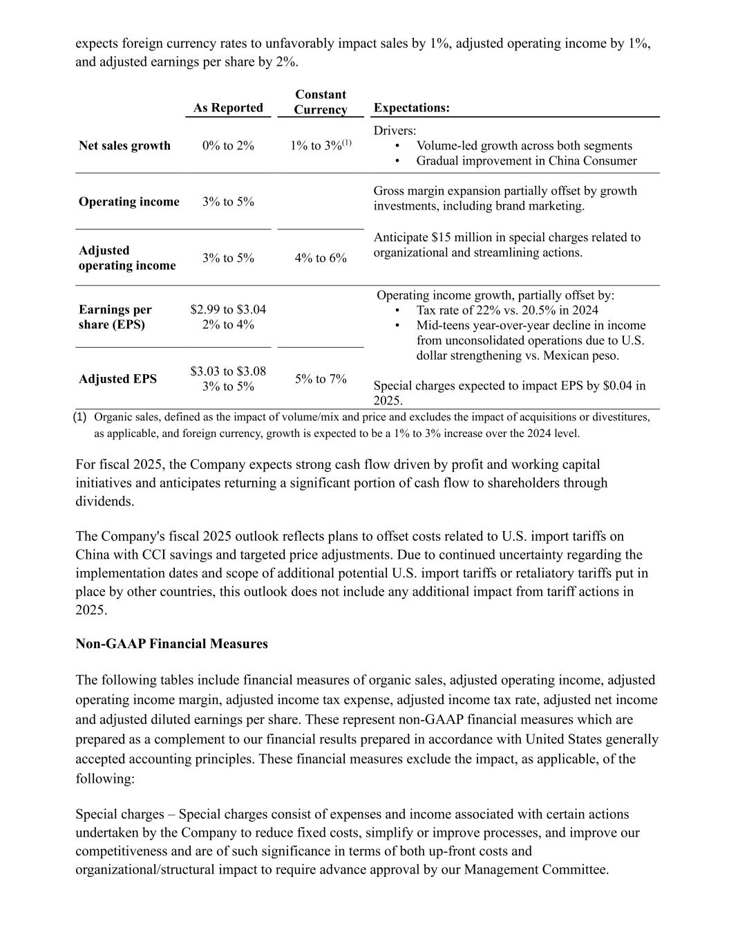 expects foreign currency rates to unfavorably impact sales by 1%, adjusted operating income by 1%, and adjusted earnings per share by 2%. As Reported Constant Currency Expectations: Net sales growth 0% to 2% 1% to 3%(1) Drivers: • Volume-led growth across both segments • Gradual improvement in China Consumer Operating income 3% to 5% Gross margin expansion partially offset by growth investments, including brand marketing. Anticipate $15 million in special charges related to organizational and streamlining actions. Adjusted operating income 3% to 5% 4% to 6% Earnings per share (EPS) $2.99 to $3.04 2% to 4% Operating income growth, partially offset by: • Tax rate of 22% vs. 20.5% in 2024 • Mid-teens year-over-year decline in income from unconsolidated operations due to U.S. dollar strengthening vs. Mexican peso. Special charges expected to impact EPS by $0.04 in 2025. Adjusted EPS $3.03 to $3.08 3% to 5% 5% to 7% (1) Organic sales, defined as the impact of volume/mix and price and excludes the impact of acquisitions or divestitures, as applicable, and foreign currency, growth is expected to be a 1% to 3% increase over the 2024 level. For fiscal 2025, the Company expects strong cash flow driven by profit and working capital initiatives and anticipates returning a significant portion of cash flow to shareholders through dividends. The Company's fiscal 2025 outlook reflects plans to offset costs related to U.S. import tariffs on China with CCI savings and targeted price adjustments. Due to continued uncertainty regarding the implementation dates and scope of additional potential U.S. import tariffs or retaliatory tariffs put in place by other countries, this outlook does not include any additional impact from tariff actions in 2025. Non-GAAP Financial Measures The following tables include financial measures of organic sales, adjusted operating income, adjusted operating income margin, adjusted income tax expense, adjusted income tax rate, adjusted net income and adjusted diluted earnings per share. These represent non-GAAP financial measures which are prepared as a complement to our financial results prepared in accordance with United States generally accepted accounting principles. These financial measures exclude the impact, as applicable, of the following: Special charges – Special charges consist of expenses and income associated with certain actions undertaken by the Company to reduce fixed costs, simplify or improve processes, and improve our competitiveness and are of such significance in terms of both up-front costs and organizational/structural impact to require advance approval by our Management Committee.